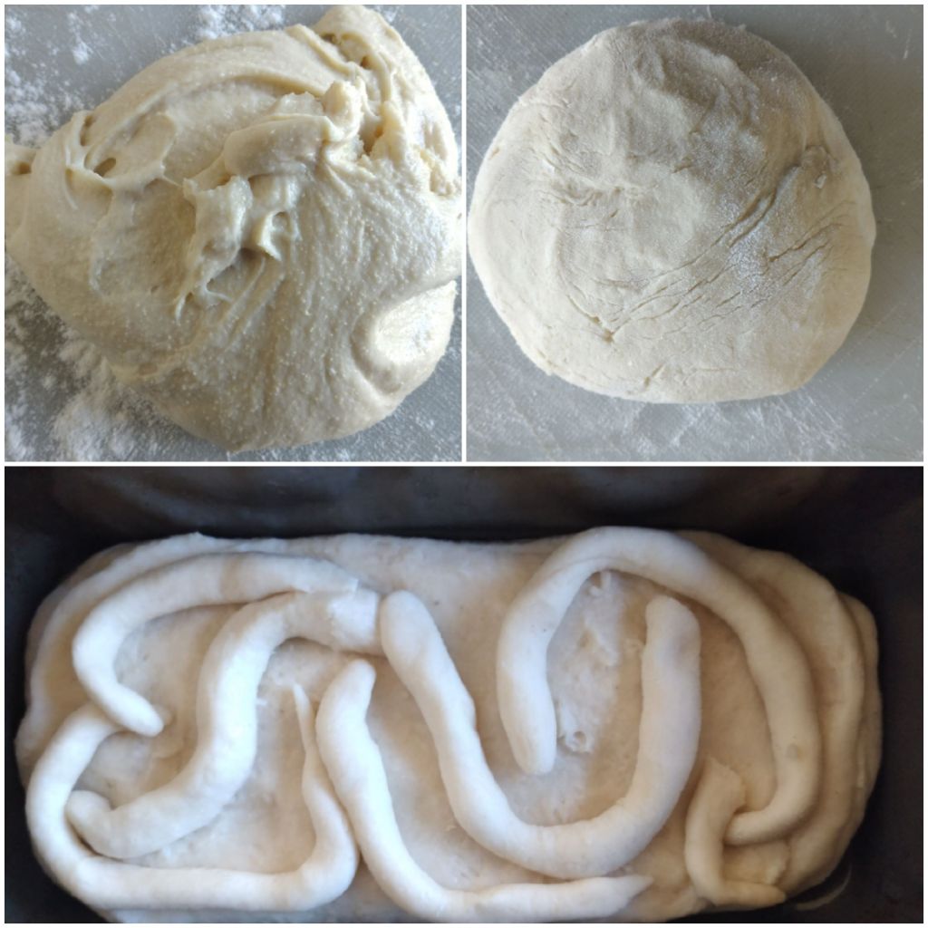 3. Turn the dough onto a floured board and knead well. Oil a pan and bring the dough to the shape and size of the pan. With little dough, we decorated the top.