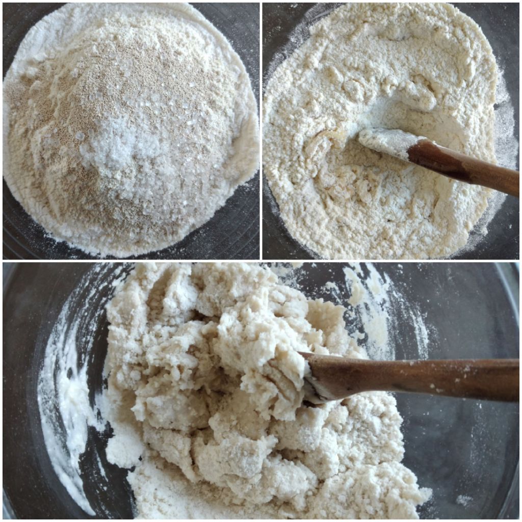 - Mix all the dry ingredients together. Add the oil. Add the water gradually to make sticky dough.