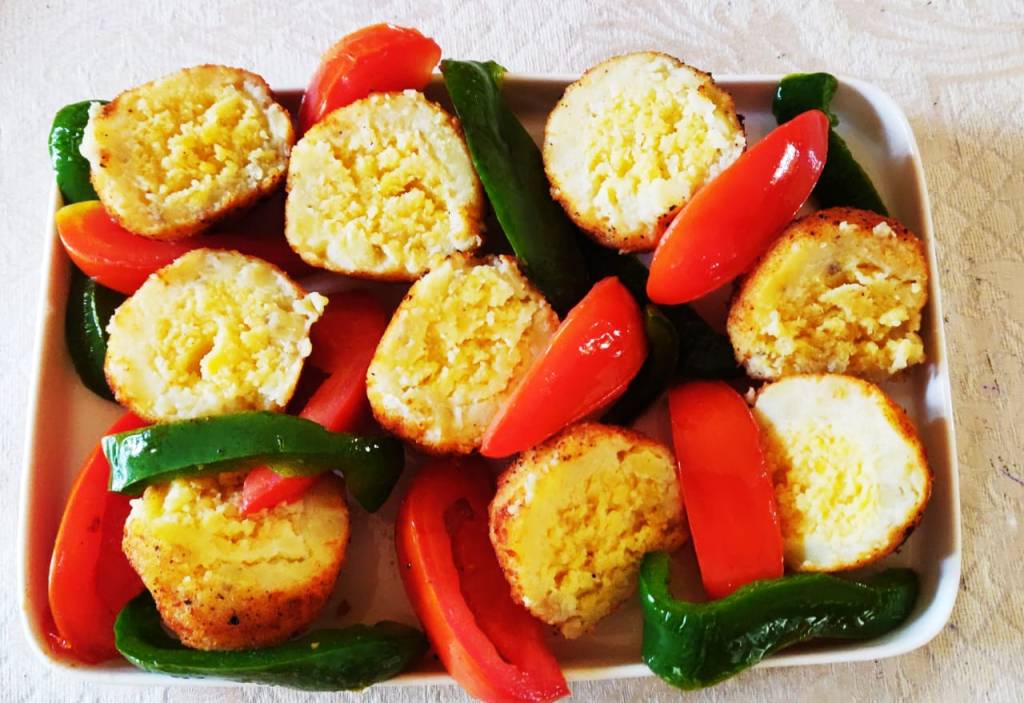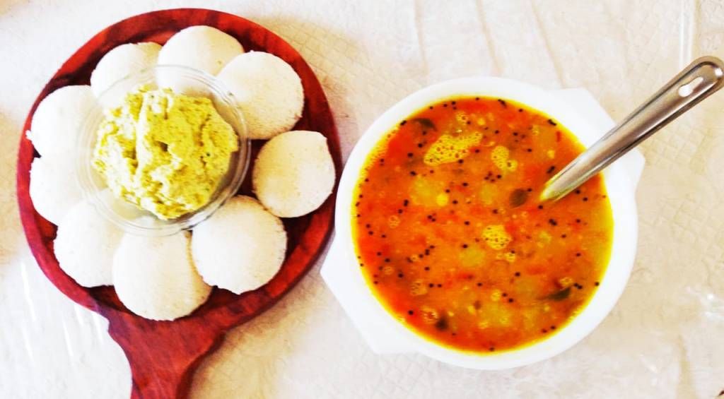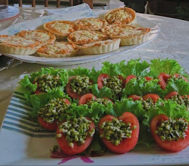 The menu is in the picture above, clockwise –  Idli, Channa chutney, Sambar Dal, Fried Moong Eggs,  Black-eyed Flan, Sprouted Moong Salad, Rajma Rice and Moong Pudding.