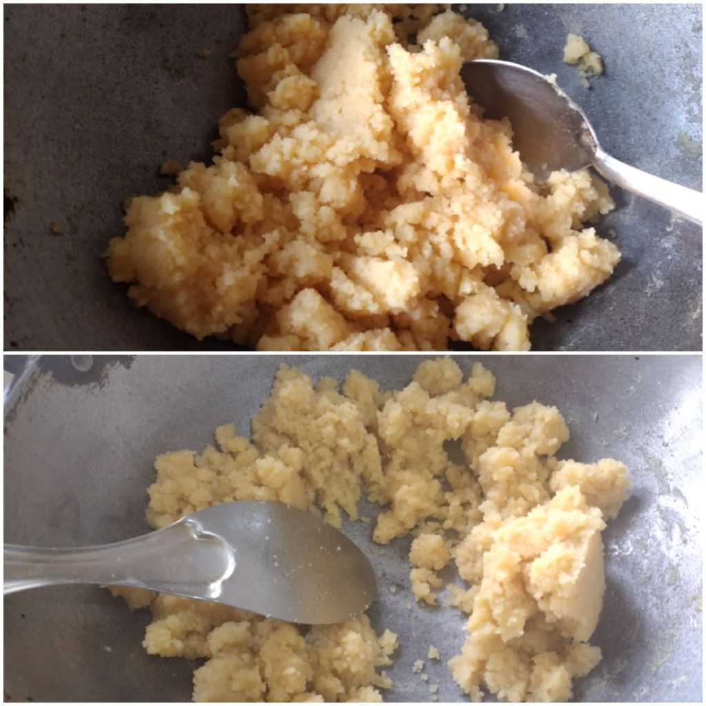 5. Heat a heavy pan and add the ghee/refined oil. When the oil is medium hot pour the moong batter and stir well. The mixture will have a tendency to stick to the pan. So you must keep stirring until the oil starts oozing out from the mixture. The base of the pan will look oily and you will get the smell of roasted moong. Switch off the heat and add the powdered sugar and mix well.
