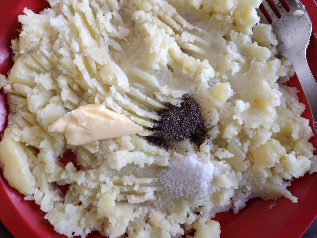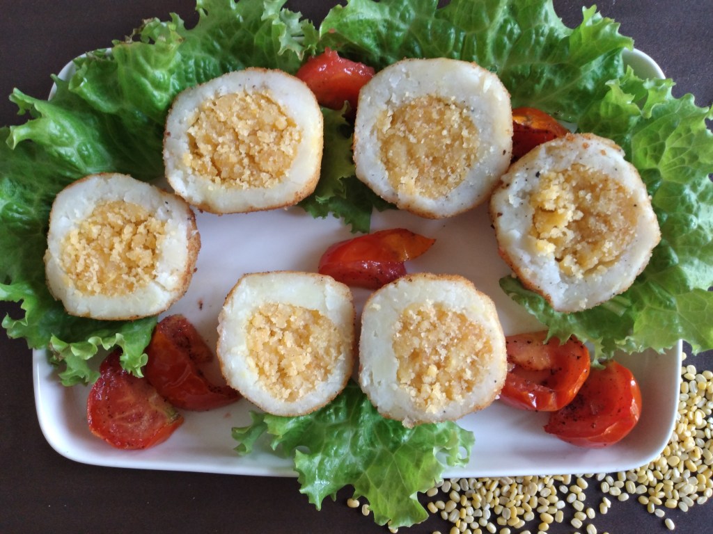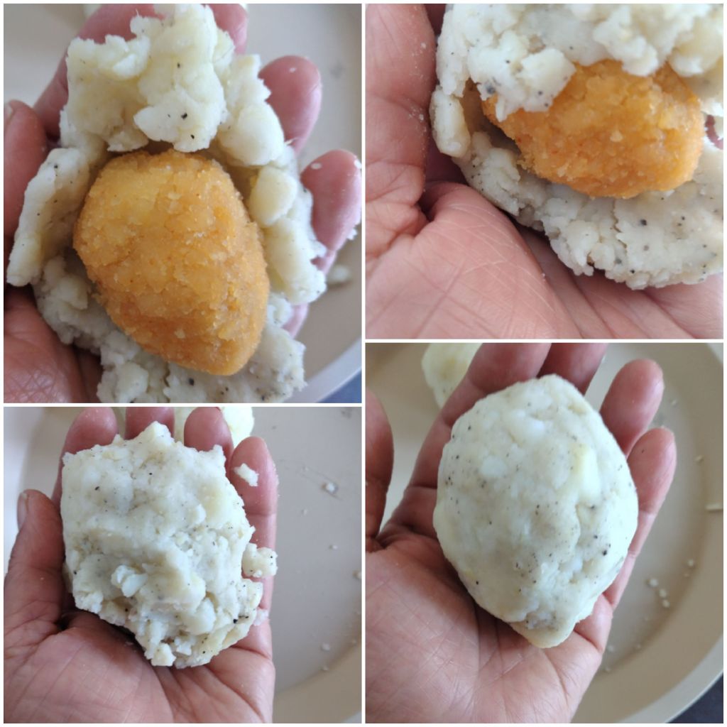 Take a small amount of mash potato on the palm of your hand and flatten it. Place a moong ball and cover it completely with potato as shown in the picture. Smooth out the surface as much as possible.