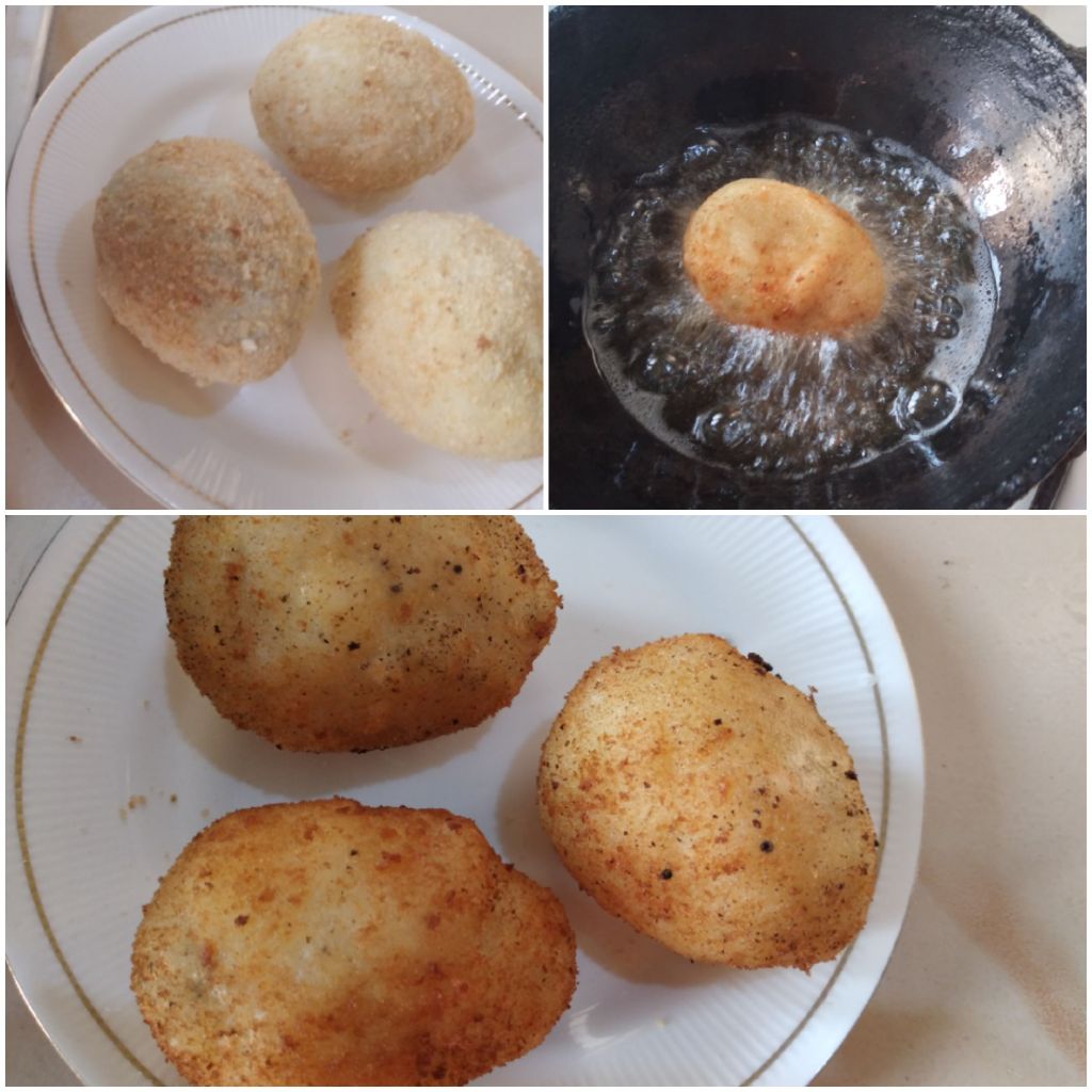Make a thin batter with 1 Tbsp of corn flour. Dip the potato balls into it. Coat the same with bread crumbs as shown in the pictures.
