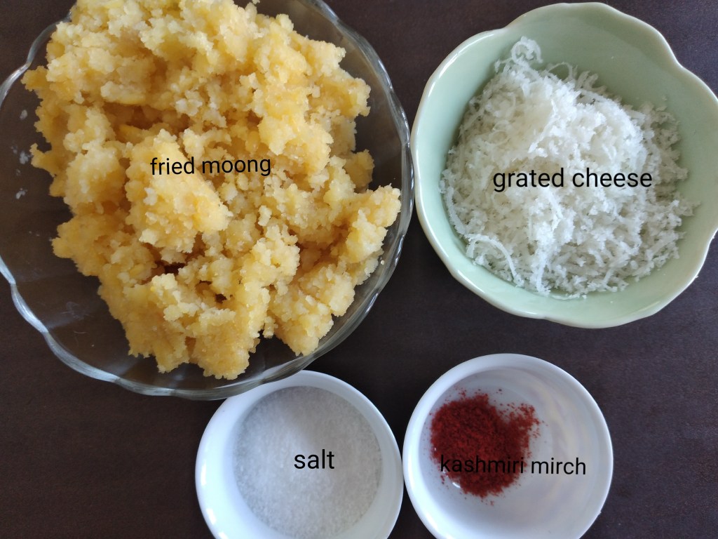 Add the grated cheese, a pinch of kashmiri mirch and salt to taste to the cooked moong and mix them well. Make small balls as big as an egg yolk.