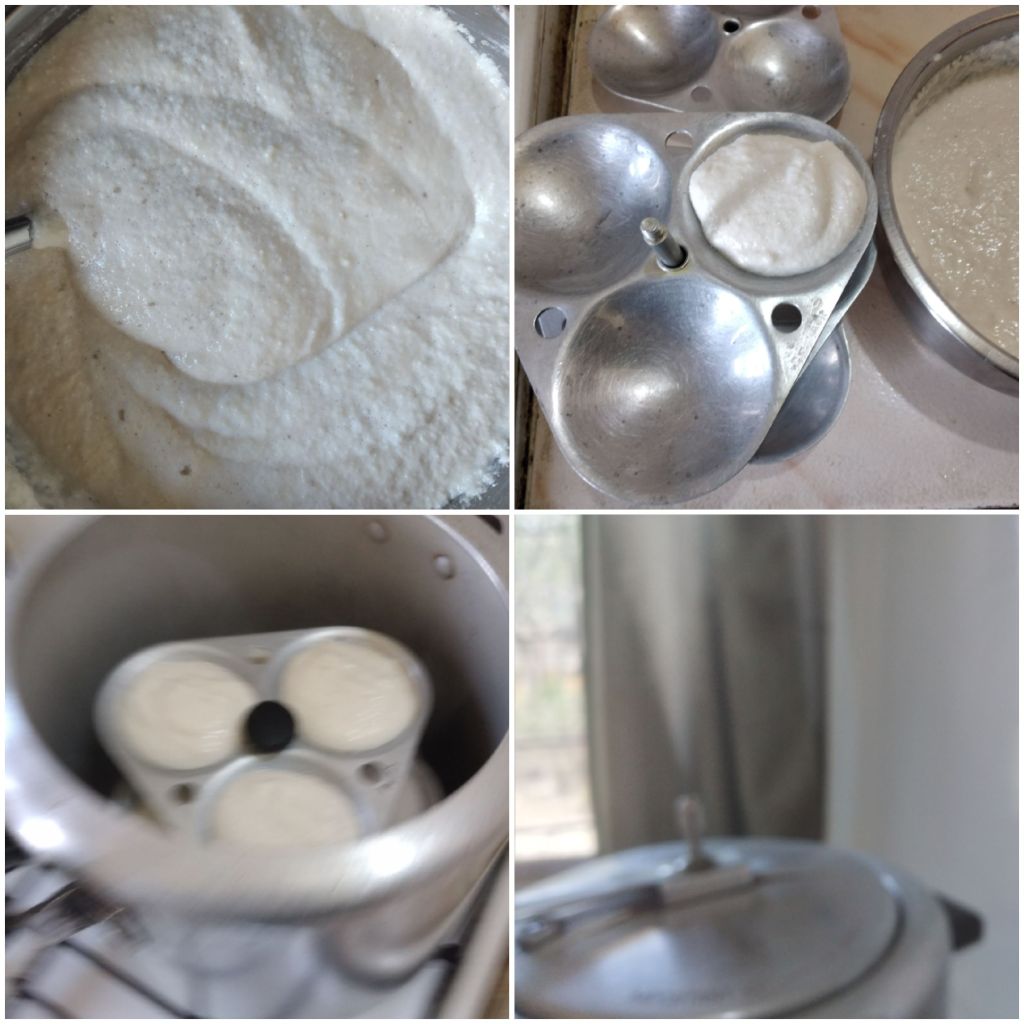 7.Place the idlis in the cooker.  Close the cooker without the pressure weight.  Once the steam escapes from the vent of the cooker.  Time it for 6 minutes and then switch of the cooker. Allow the cooker to cool.