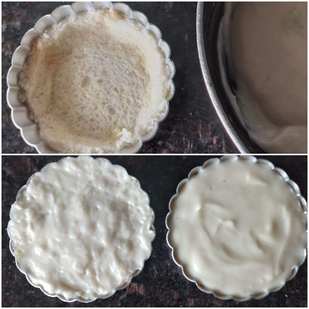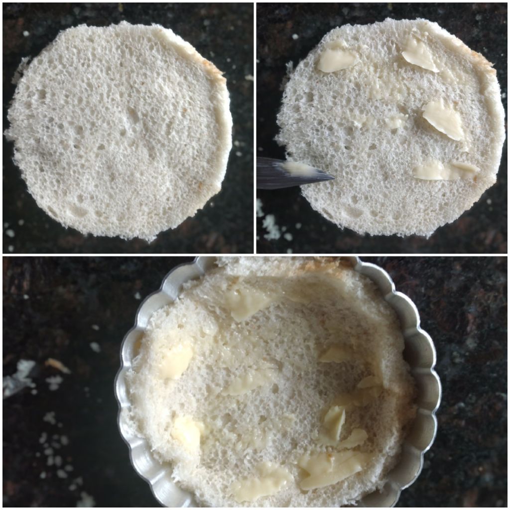 Butter the flan case and the bread. Place the bread at the base and press it evenly into the case. Do the same for the other case as well.