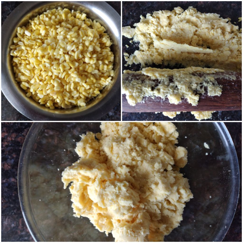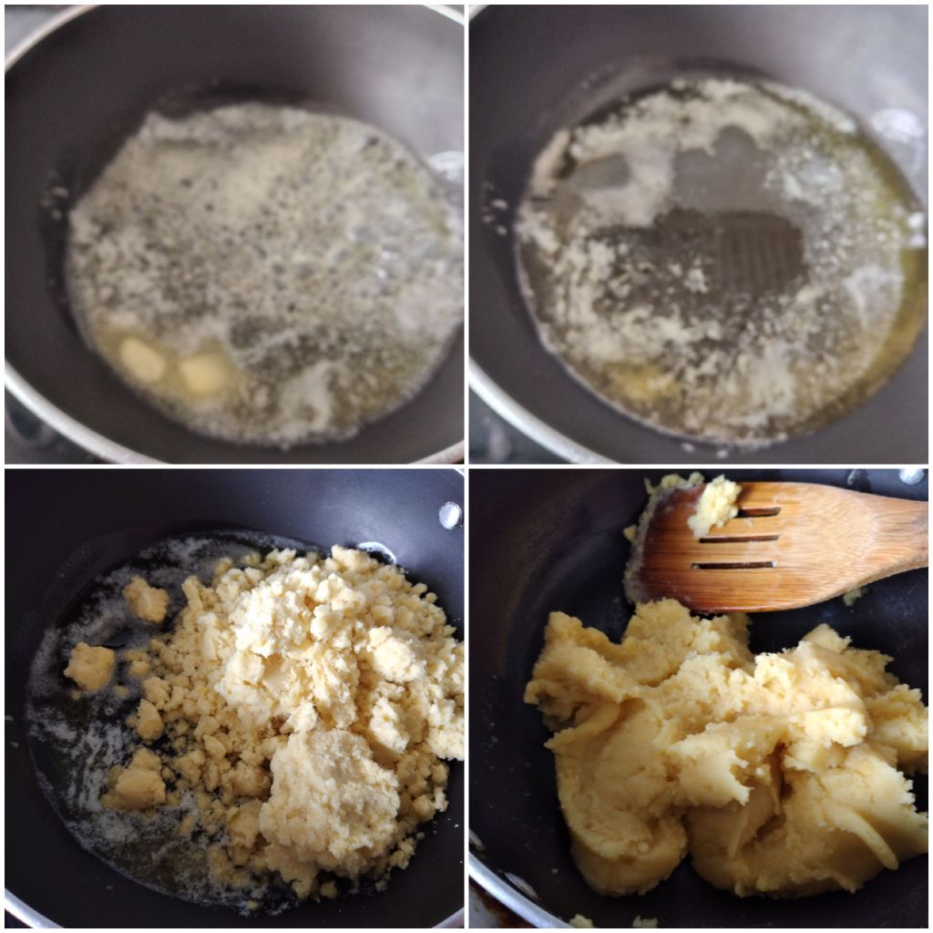 Melt butter in a non-stick pan over medium heat. Add oil and then the moong paste. Keep stirring till the dal absorbs the oil.