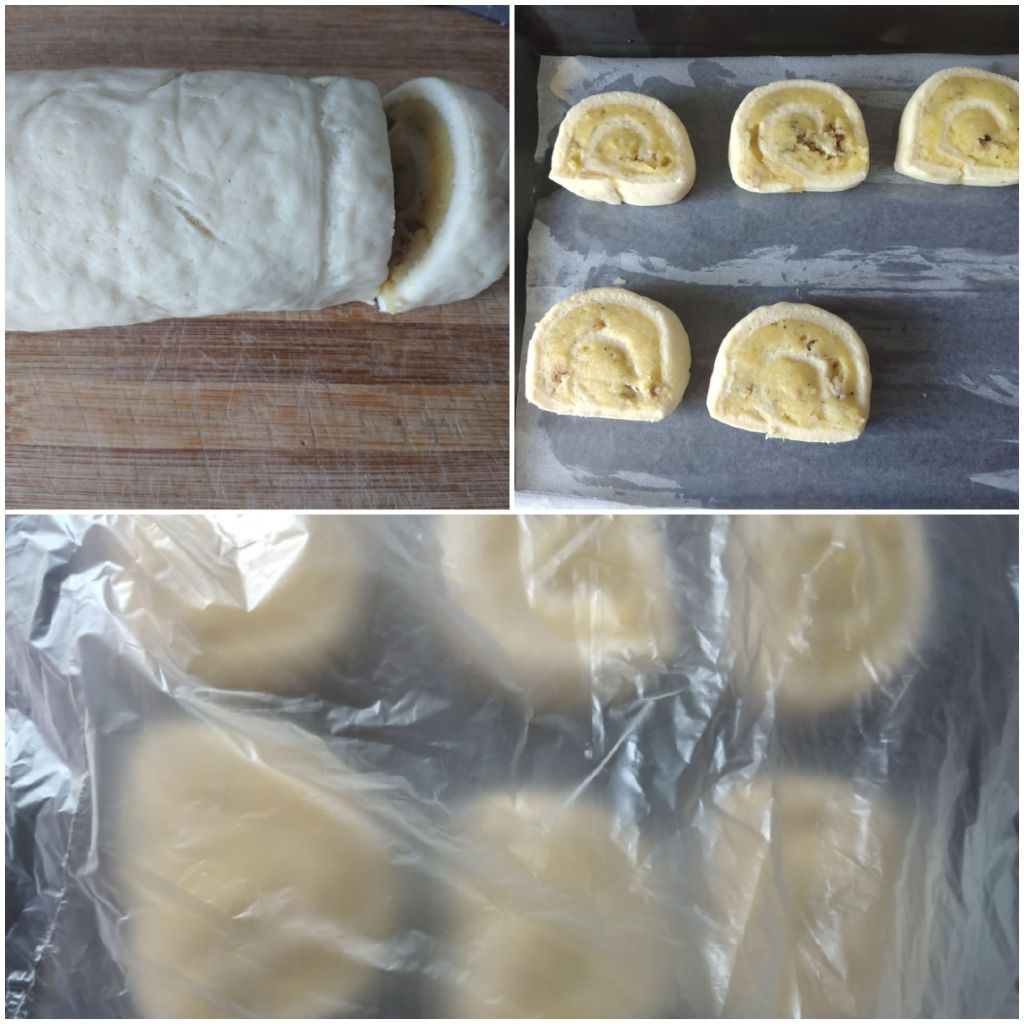 Cut the roll into slices of 2 cm thickness with a sharp knife. Grease and line the baking tray with buttered paper. Place the sliced pieces on it. Cover with an oiled plastic sheet and leave it in a warm place for 1 hour to for proofing.