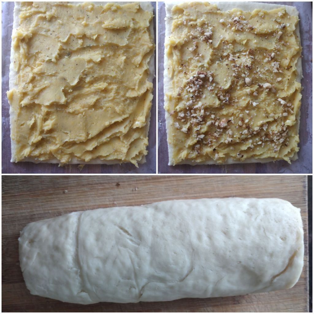 Spread the moong mixture over the dough evenly. Sprinkle the crushed walnuts over it. Roll the dough as in Swiss roll, starting with the shorter side. Leave it in the fridge for 10 minutes.