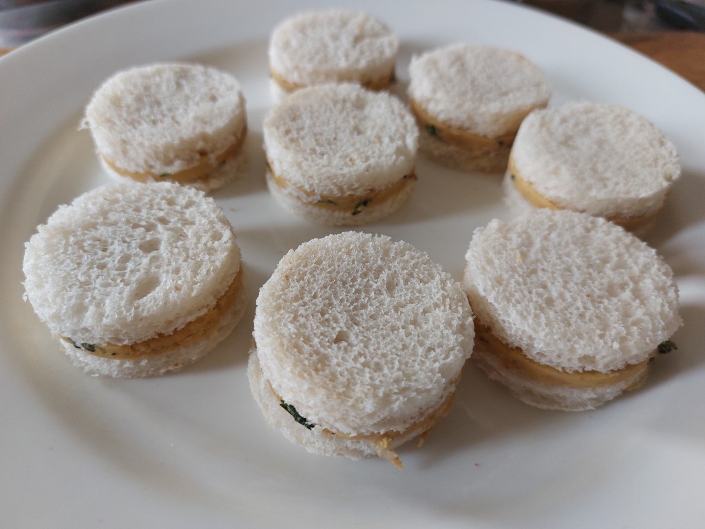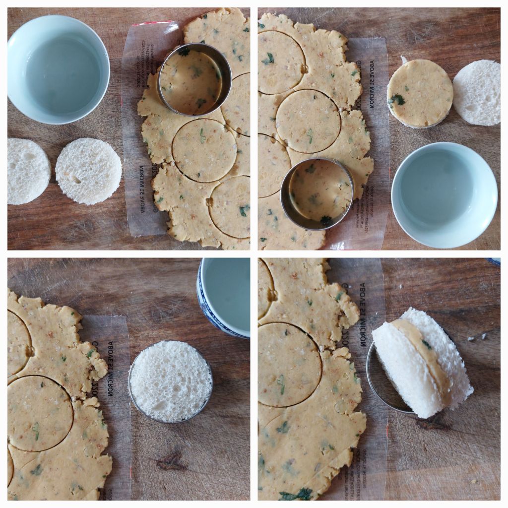 10. Take 2 round pieces of bread and 1 round dal piece and sandwich them as shown the picture.