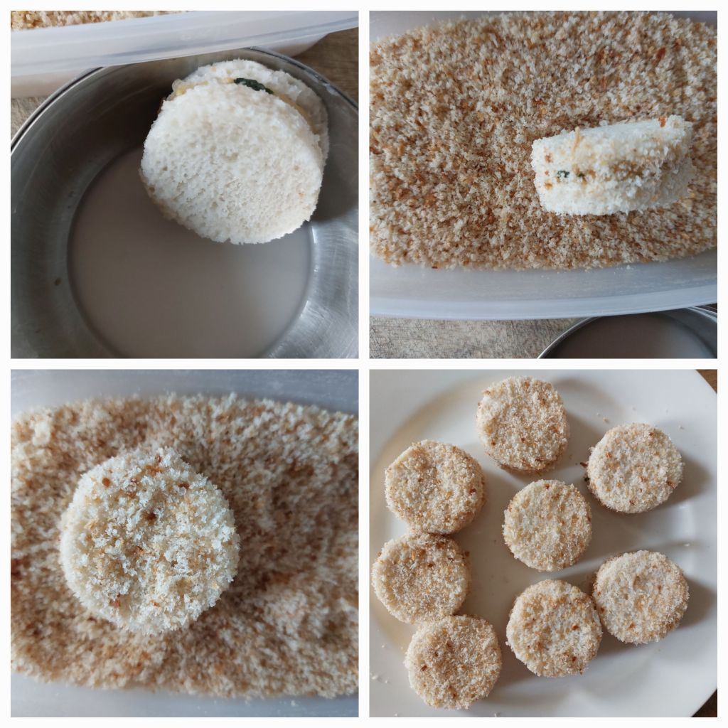 14. Dip a round sandwich in the corn flour liquid and then roll it over the bread crumbs.  See that the dal layer is properly coated.