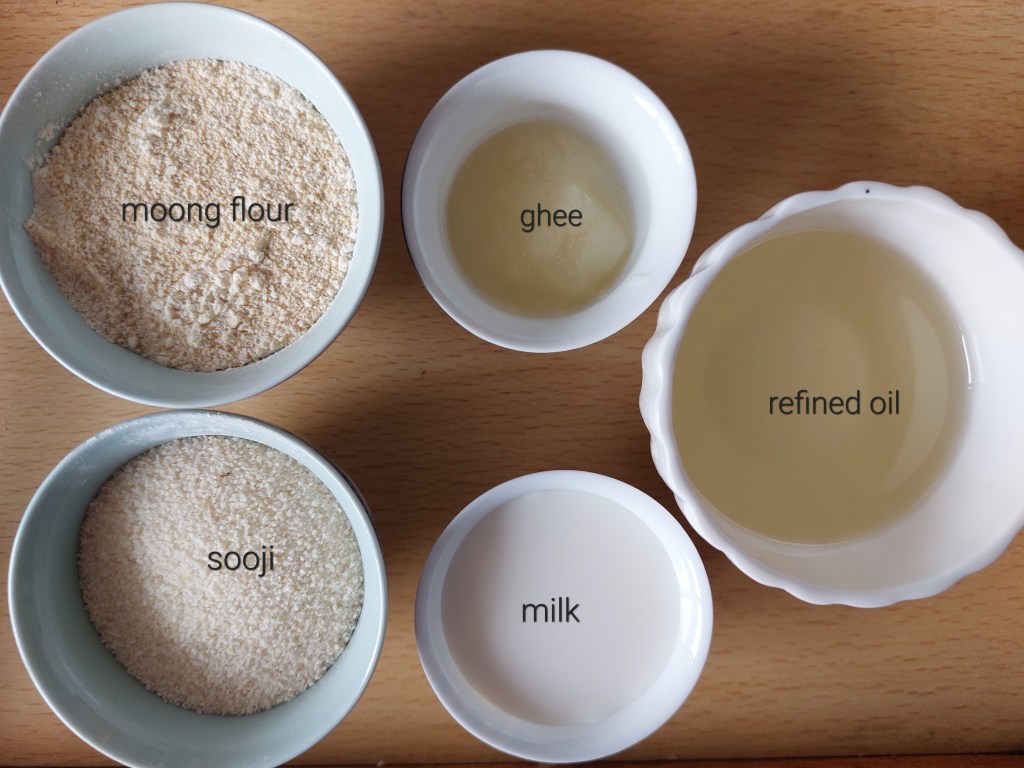 - Mix moong flour and sooji together and fry over low heat till the raw taste disappears.