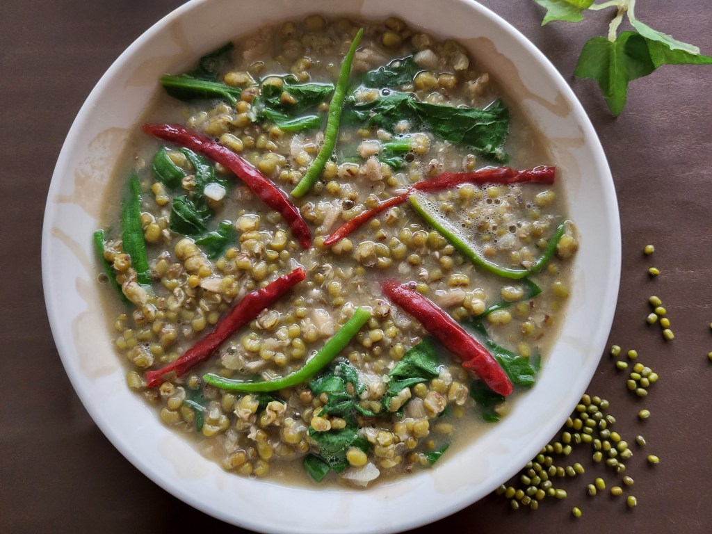 This is an easy and nourishing dal dish. There is no spice and no oil. But a whole lot of fresh red chilies. Since we did not get the red chilli, we used both red dried chillies and green chillies. Mustard greens and bamboo shoots added more to the flavour. We enjoyed it. Hope you will try it out too.