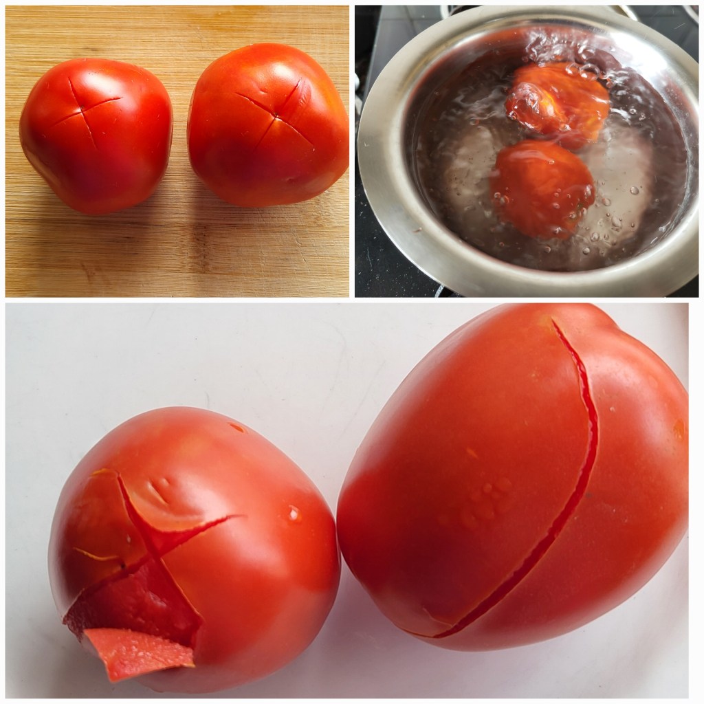 7. Boil water in a pan and plunge the tomatoes into it.  Cover and leave it for 2-3 minutes.