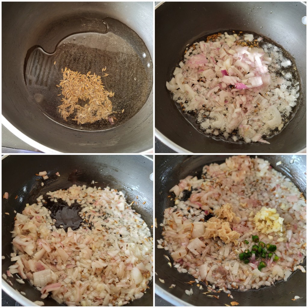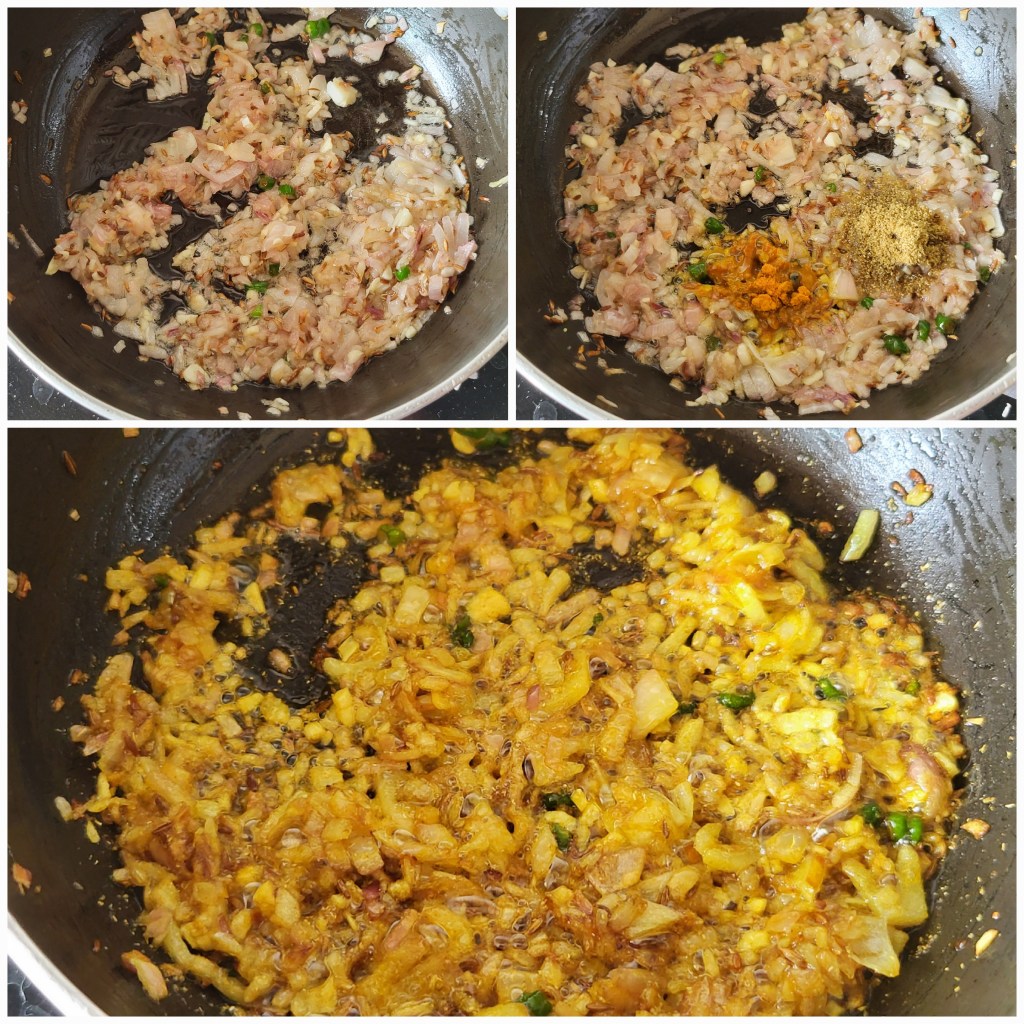 17. Add the garlic, ginger and chilies and keep frying till the mixture is golden brown.