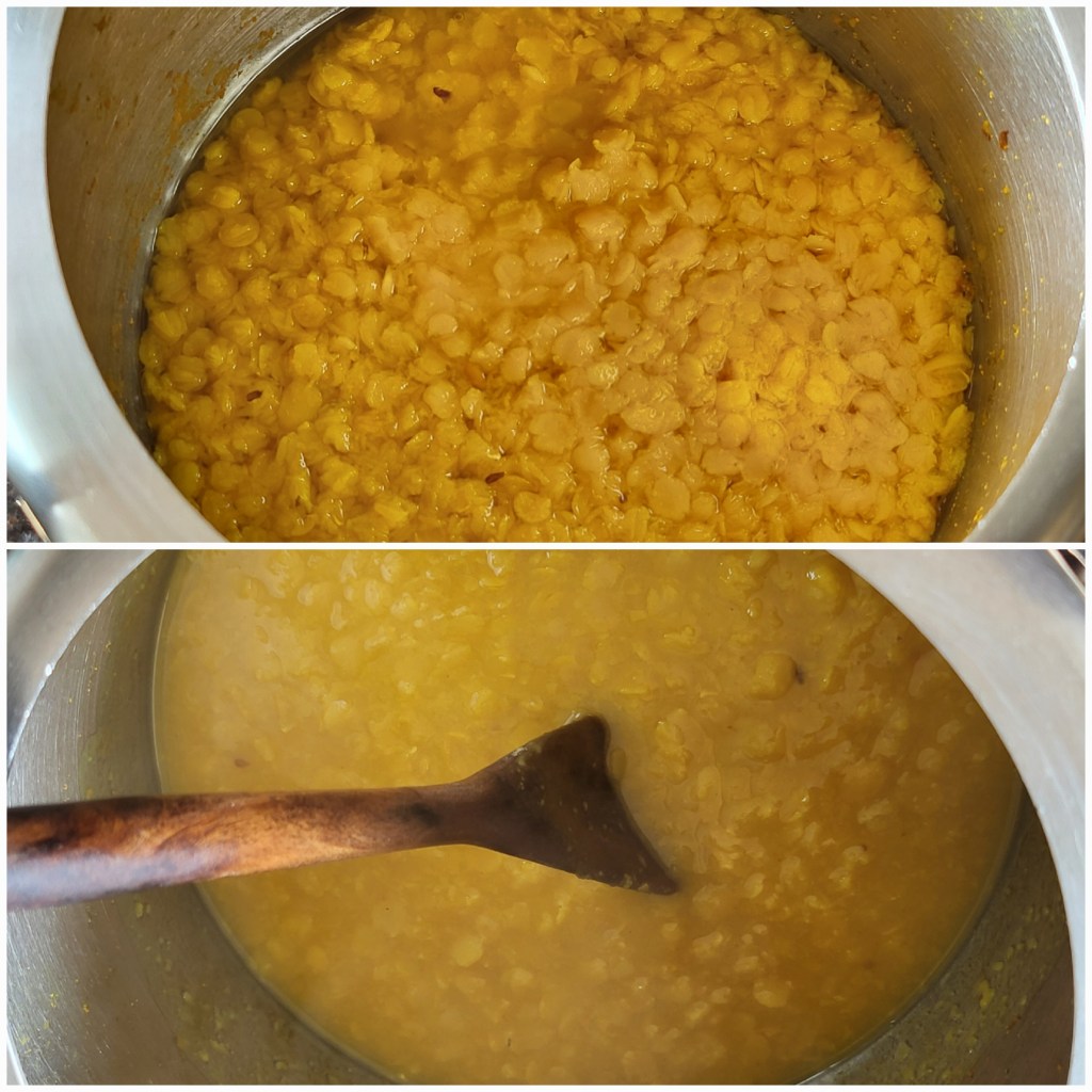 7. Stir the dal until it reaches a mushy consistency, then add about 1 cup of warm water and set aside.
