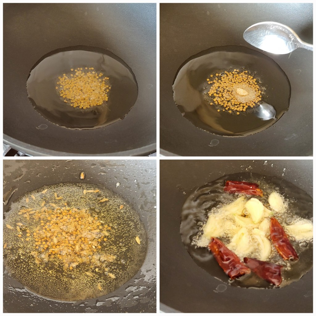 16. Add mustard seeds, hing, and cumin seeds. Allow the mustard seeds crackle.
