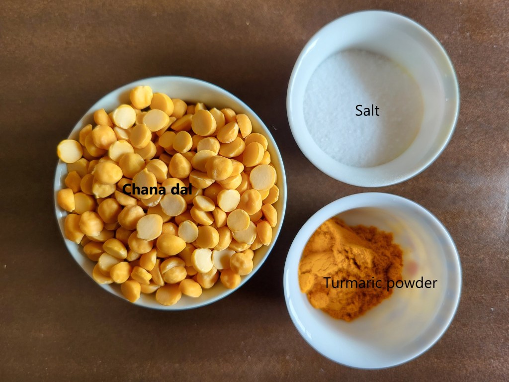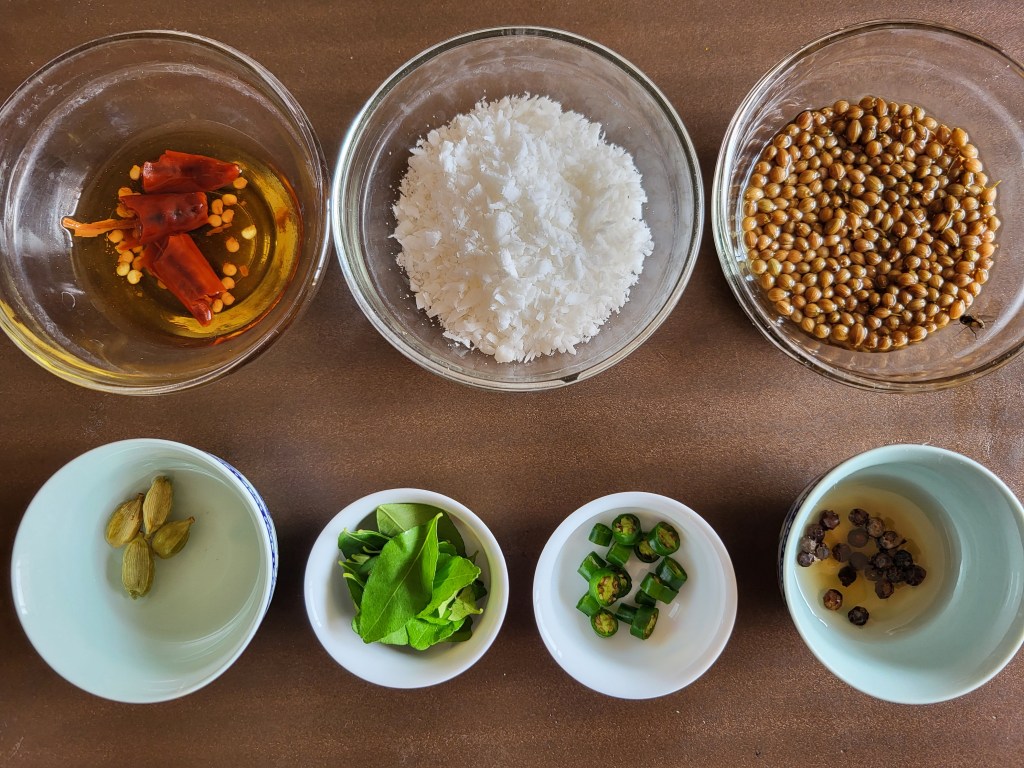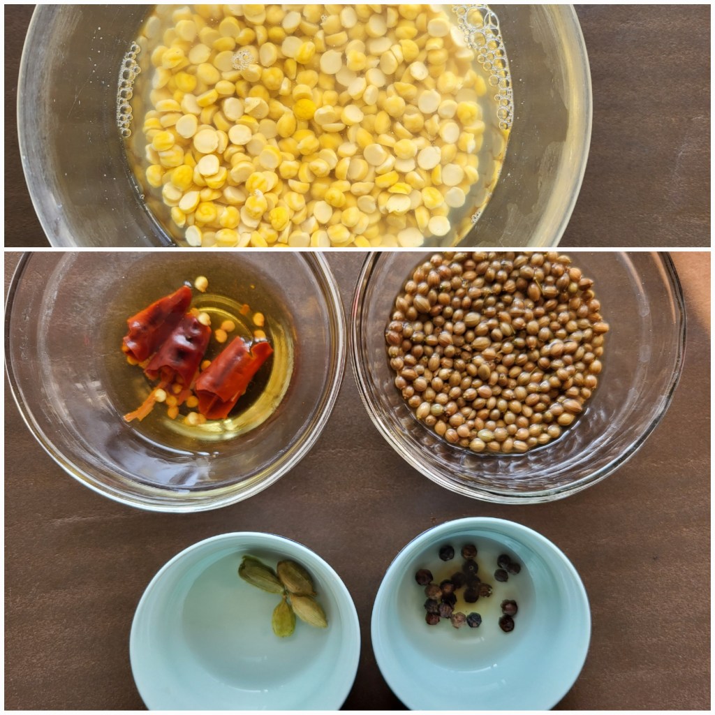 - Soak the following ingredients separately in water for about 30 minutes: – dal, dried red chilies, coriander seeds, cardamom and black peppercorns, as in the picture.