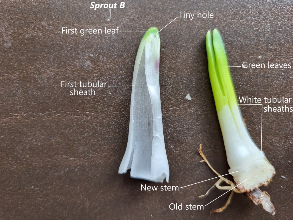 Take a closer look at sprout B and notice the tiny opening on the inner side. This small opening is the only exit route for the green leaves still inside the tubular sheath.