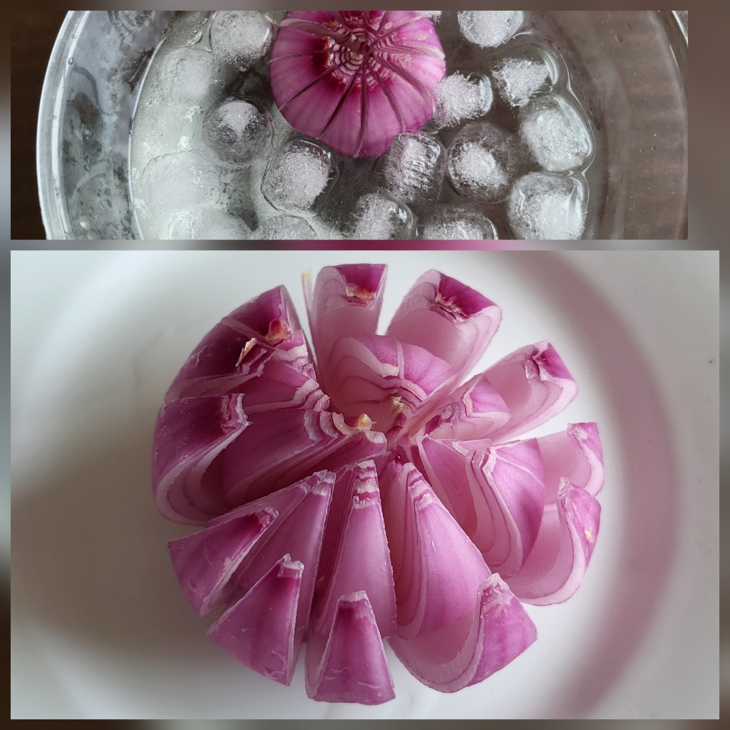 8. Soak the onion in cold water with ½ tsp of salt for 30 minutes in the fridge.
