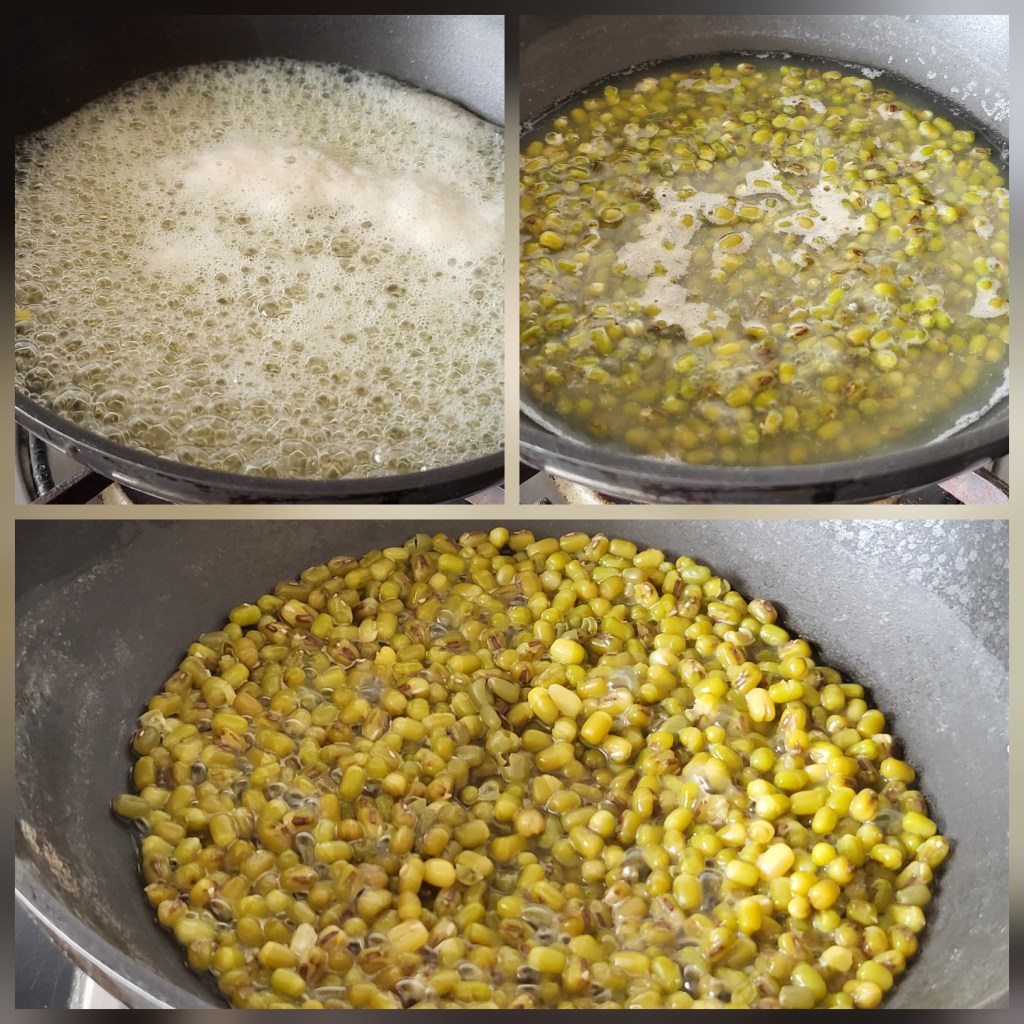 4. Skim off any scum that forms on the surface while cooking the mung beans.