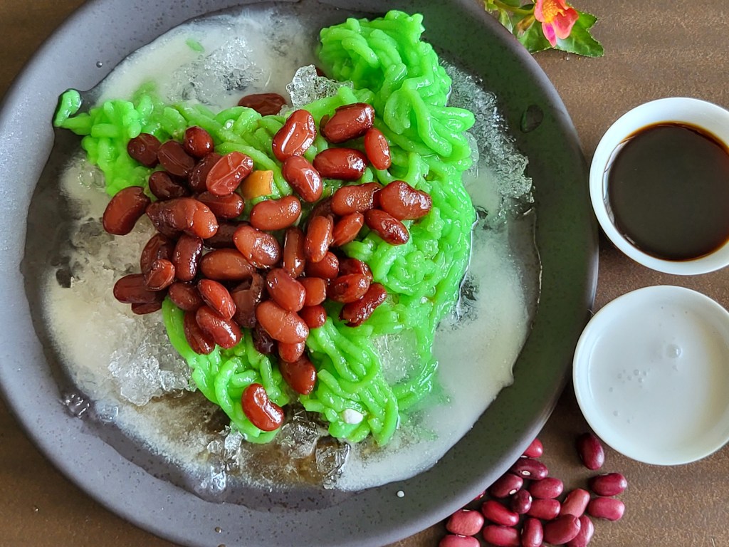Let’s try Chendol with a delicious red bean topping! Chendol is a traditional and a popular Southeast Asian dessert, especially in Singapore, made with shaved ice, coconut milk, and rice flour jelly. The red bean topping adds a delightful texture and a pop of color to this sweet treat.