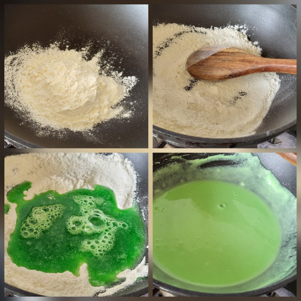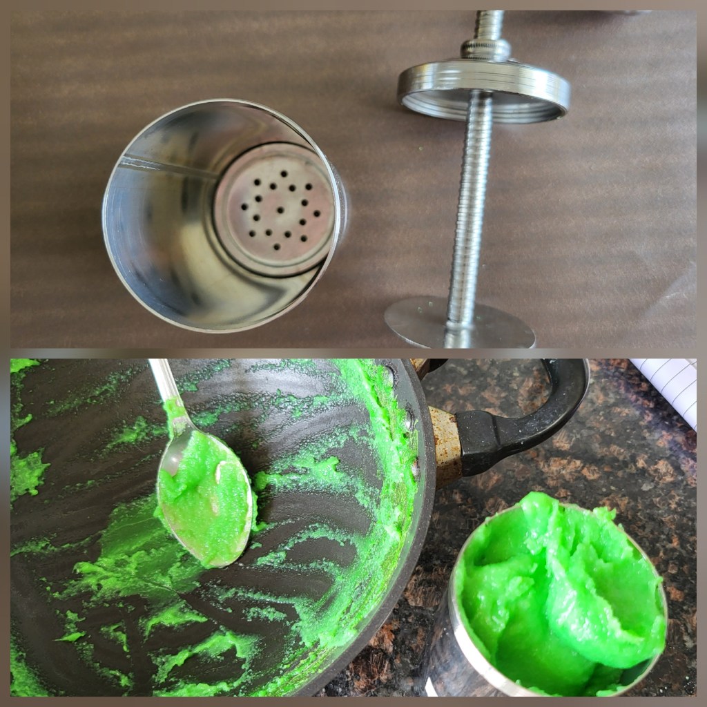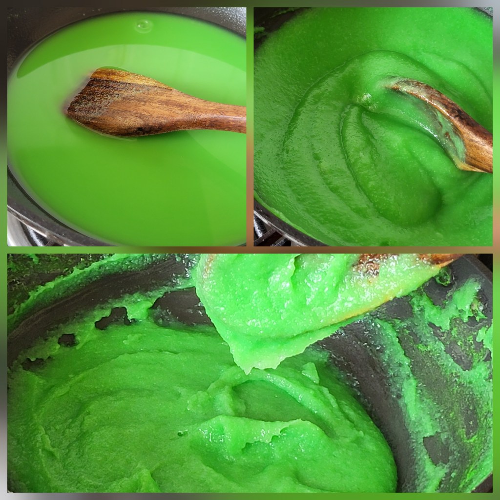 4. Cook the green mixture over low heat, stirring constantly, until it thickens to the point where it holds its shape and doesn’t drip easily from the ladle.