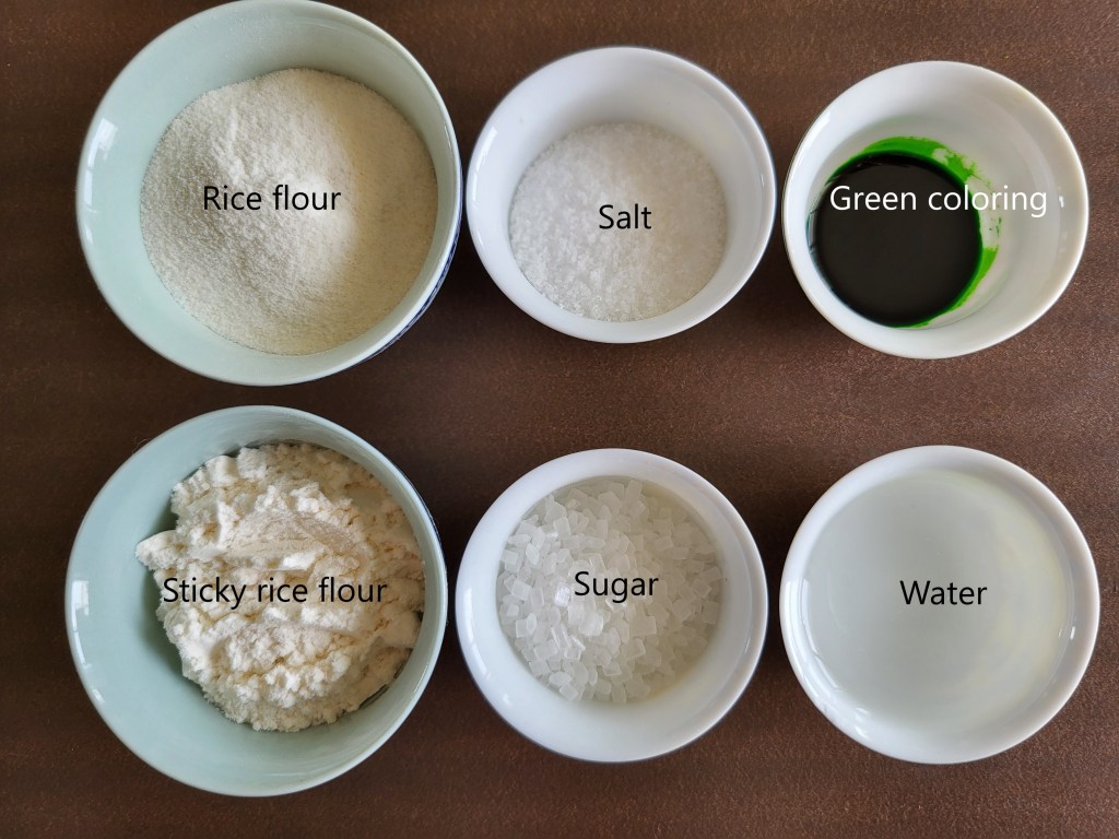 2. Mix together sticky rice flour, rice flour, salt, and sugar in a pan.