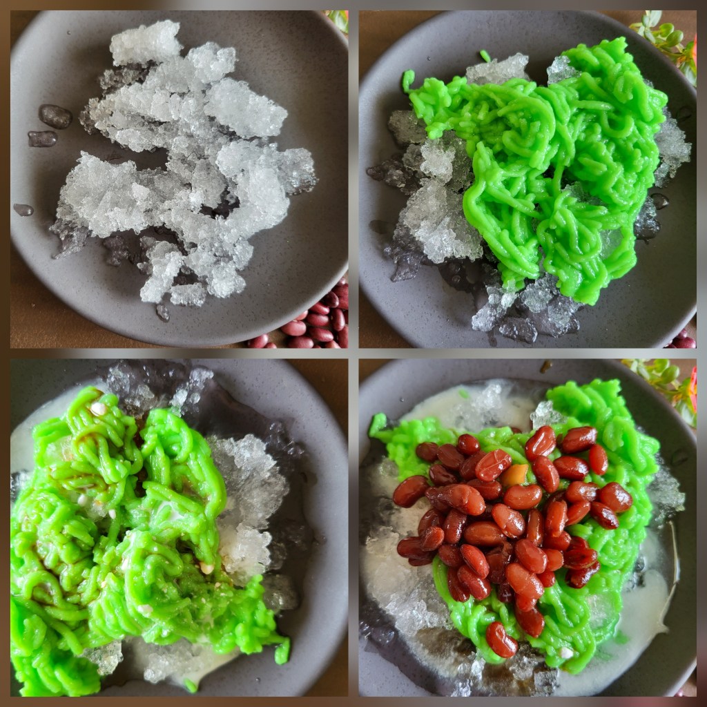 - Add Chendol noodles on top, followed by a drizzle of palm sugar syrup and coconut milk.