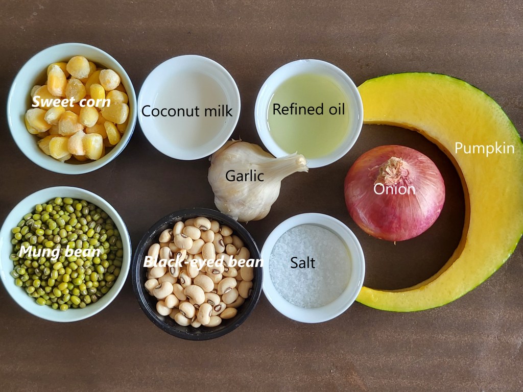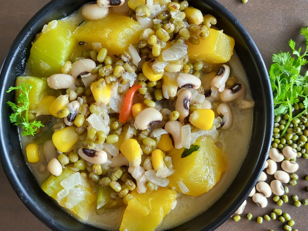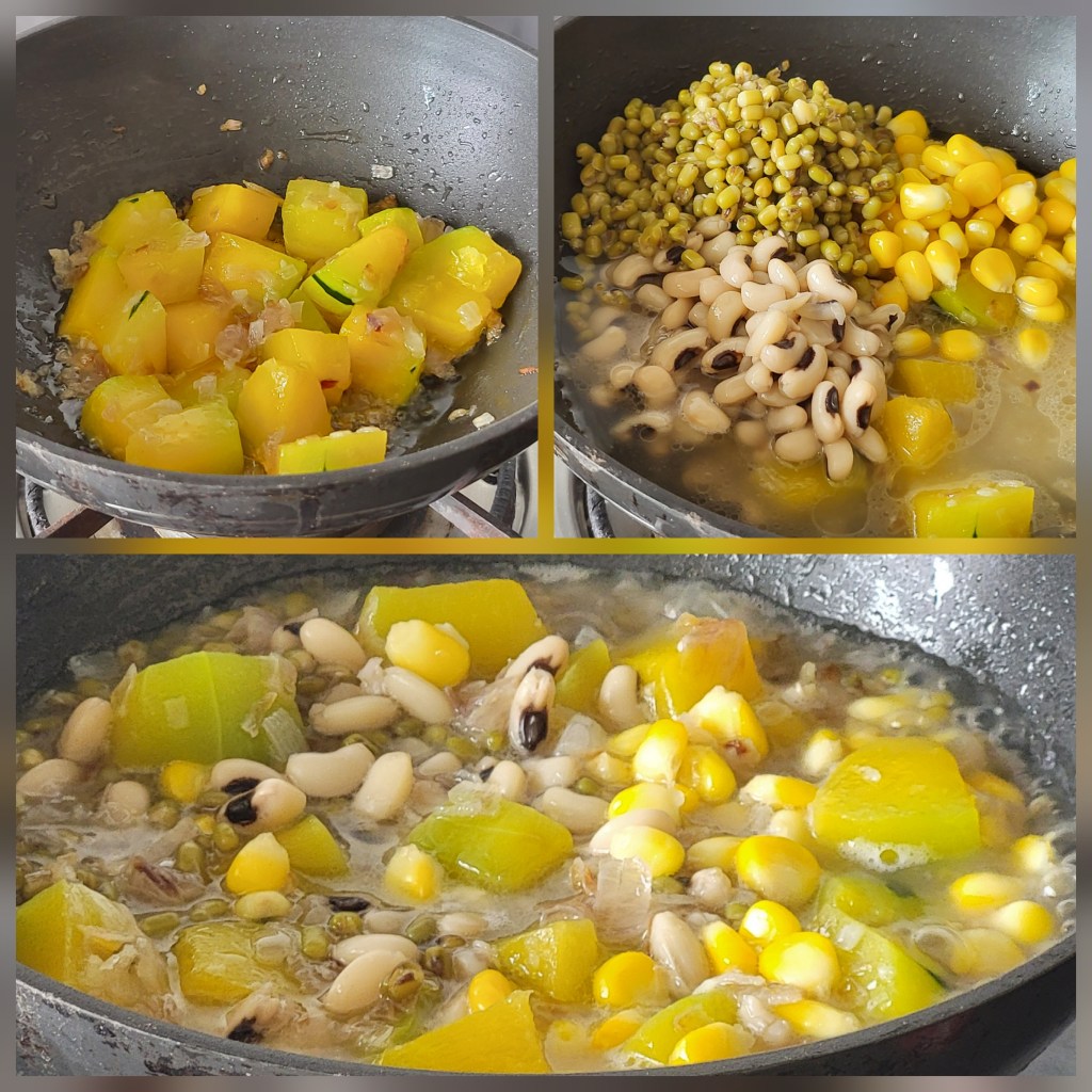 10. Add the cooked mung beans, black-eyed beans, and corn along with their cooking water to the pumpkin mixture.