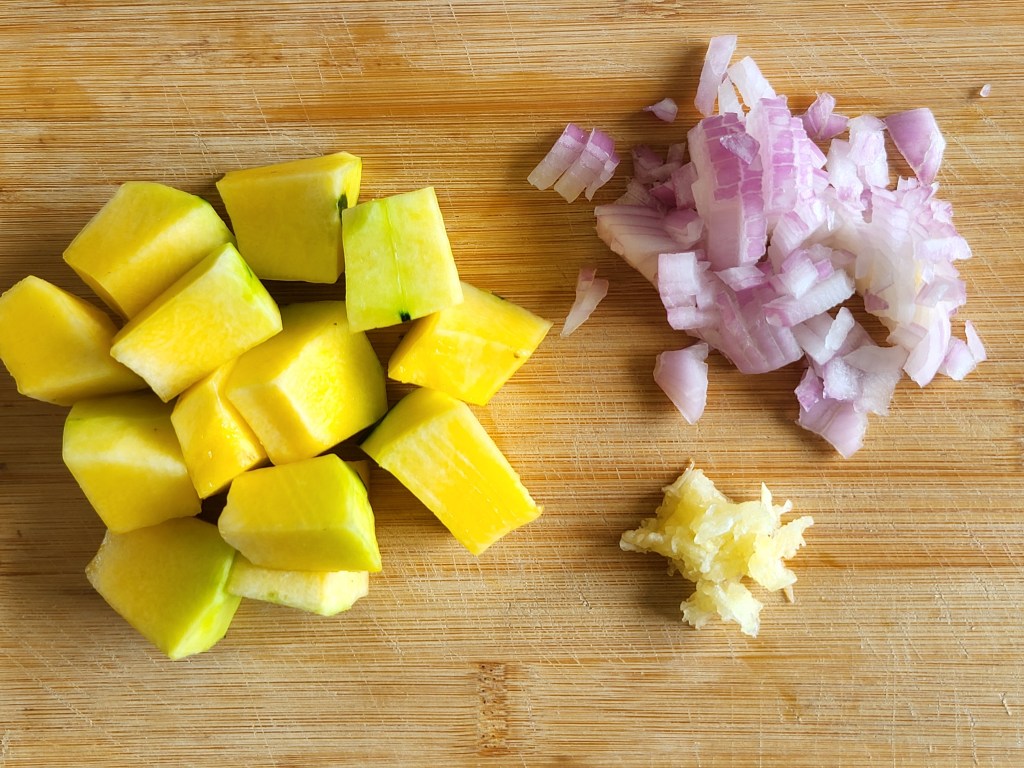 6. Meanwhile, prep the veggies: peel and dice the pumpkin into small cubes, finely chop the onion, and grate the garlic.