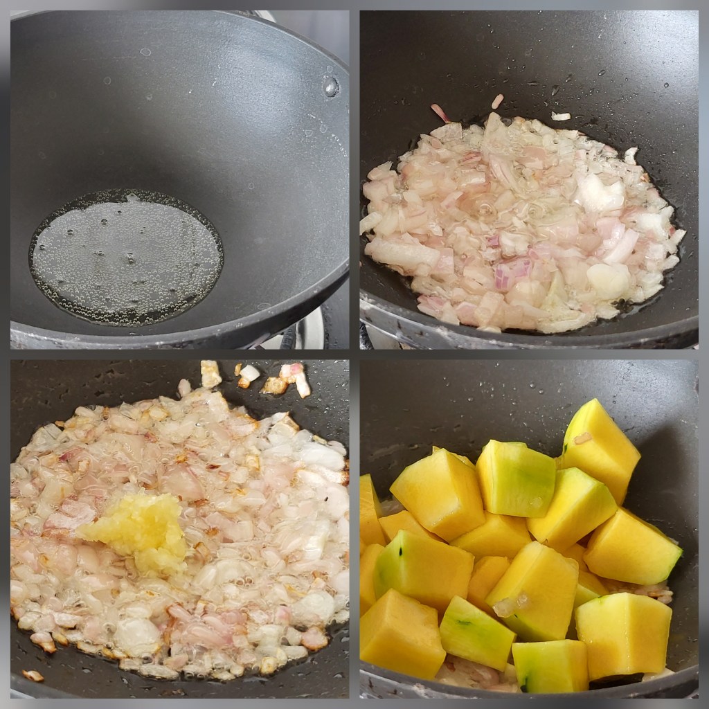 9. Then, add the pumpkin, mix well with spices, cover, and cook until the pumpkin is half done, stirring occasionally, over low flame.