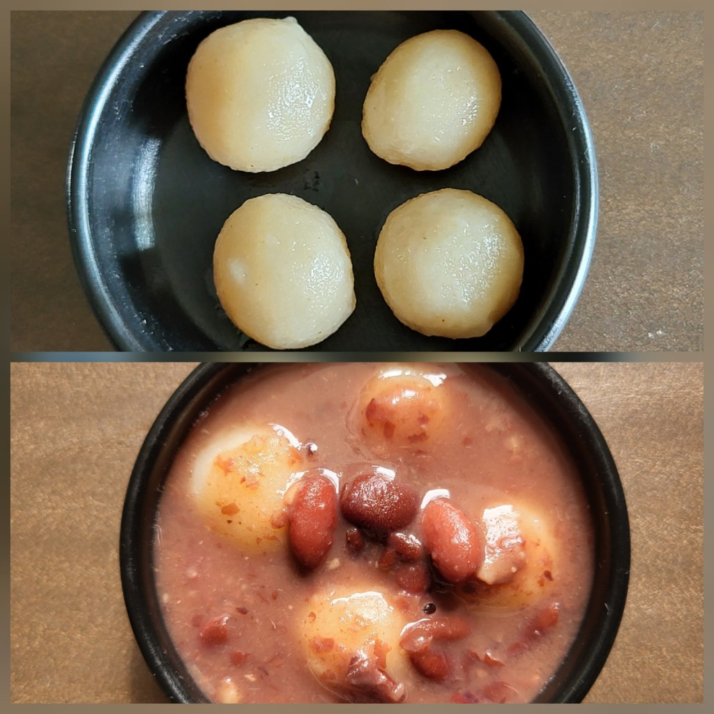 16. To serve, place a few glutinous rice flour balls in a bowl and pour the warm sweet red bean soup over them. Serve warm or at room temperature.
