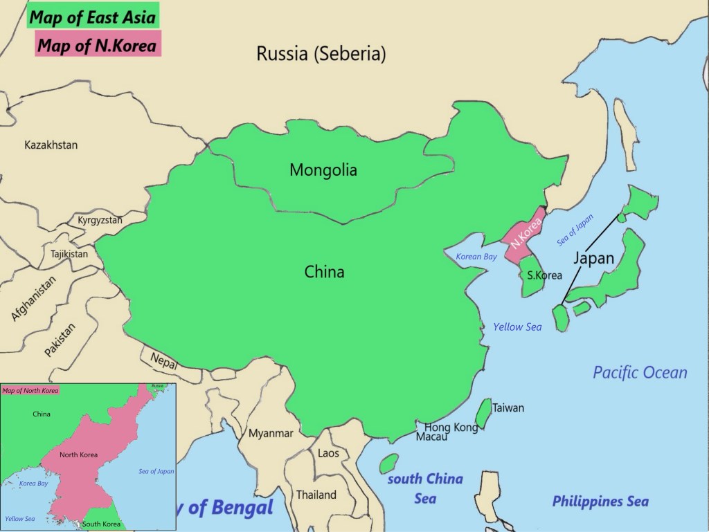 It shares a border with South Korea to the South, China and Russia to the north and faces the Korean Bay to the west and Sea of Japan to the east.