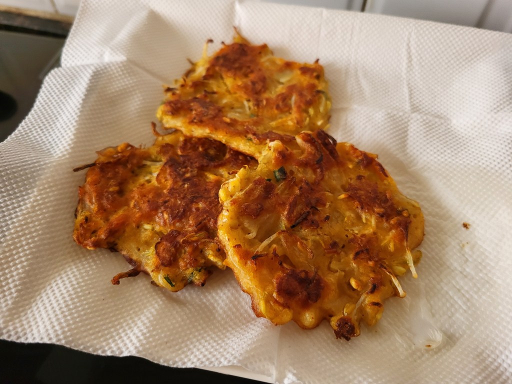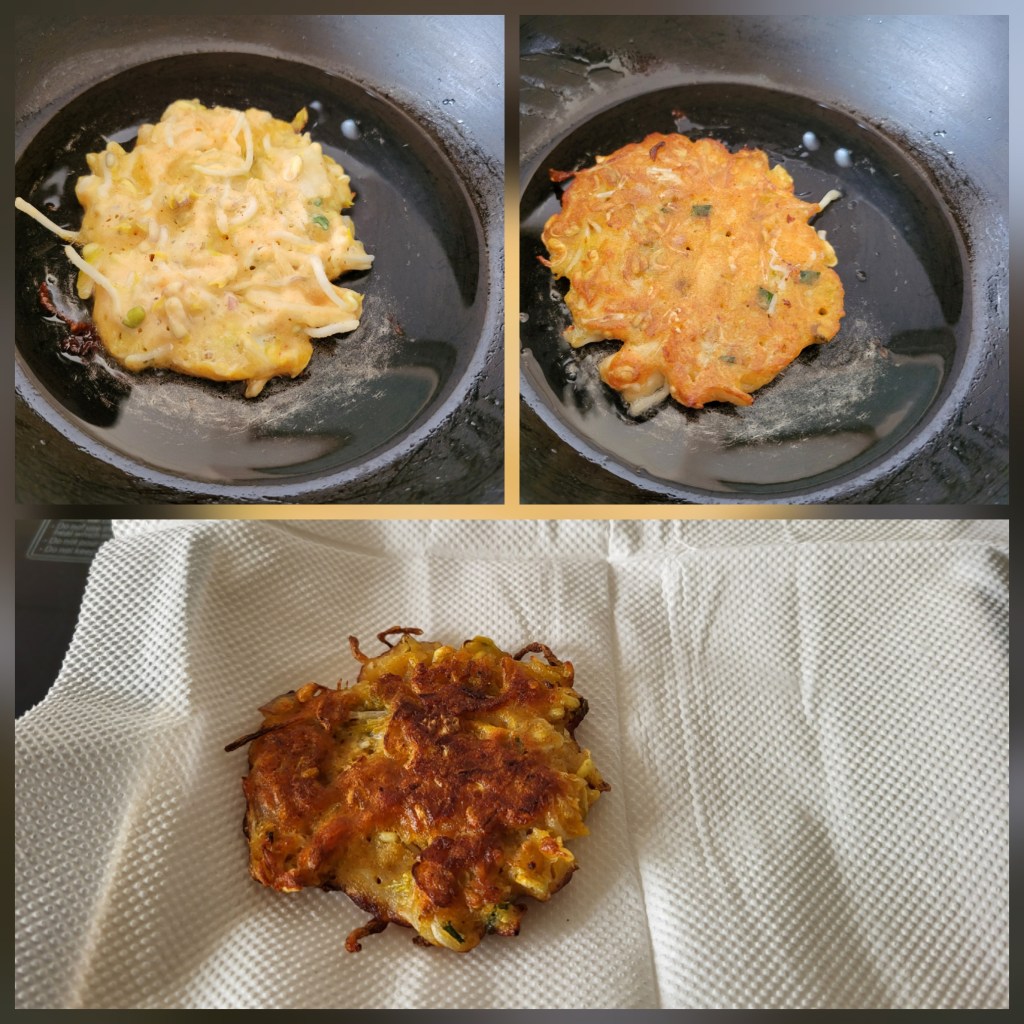 7. Scoop a tbsp of batter onto the pan, spread it into a round with the back of a spoon, and cook for 2-3 minutes till it’s golden brown.