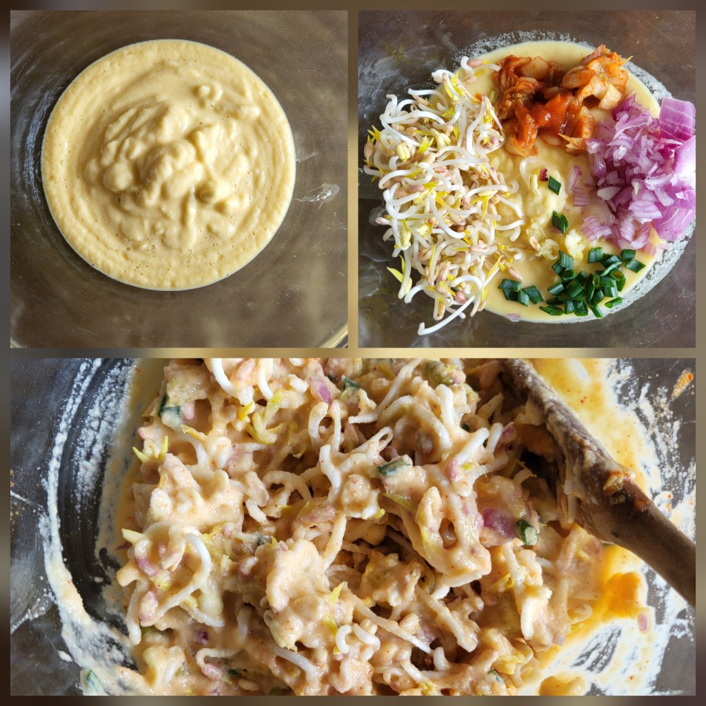 5. Add in the mung sprouts, chopped onion, grated garlic, green onion leaves, and baking powder, into the mung-rice mix, and give it a good stir – blend those flavours together!