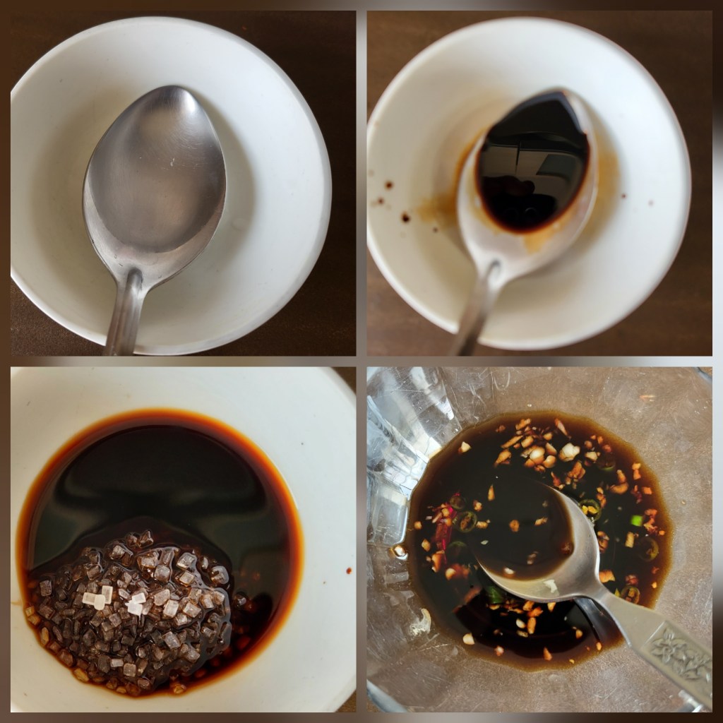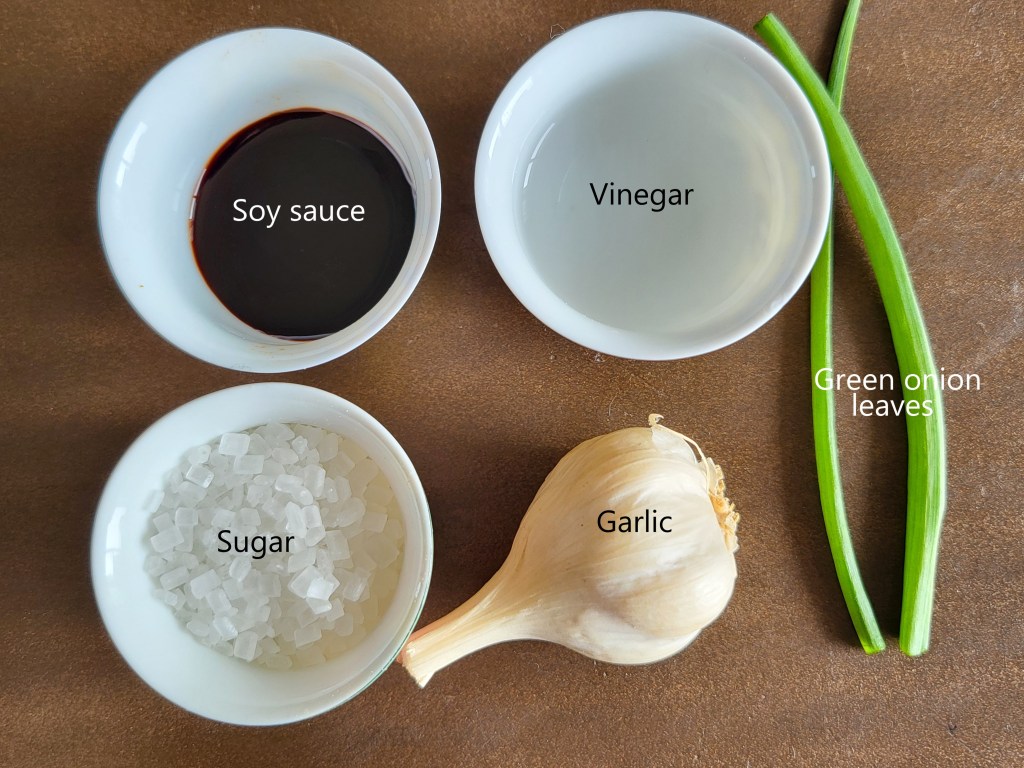 11. Make the sauce: In a small bowl, mix 1 tbsp vinegar, 1 tbsp soy sauce, and 1 tsp sugar till the sugar’s dissolved, then add ½ tsp grated garlic and ½ tsp chopped green onion.