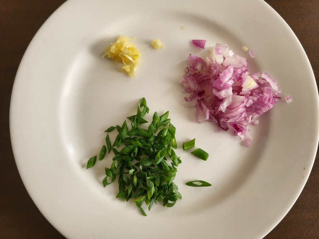7. Grate the garlic, chop the onion, and slice those green onion leaves.
