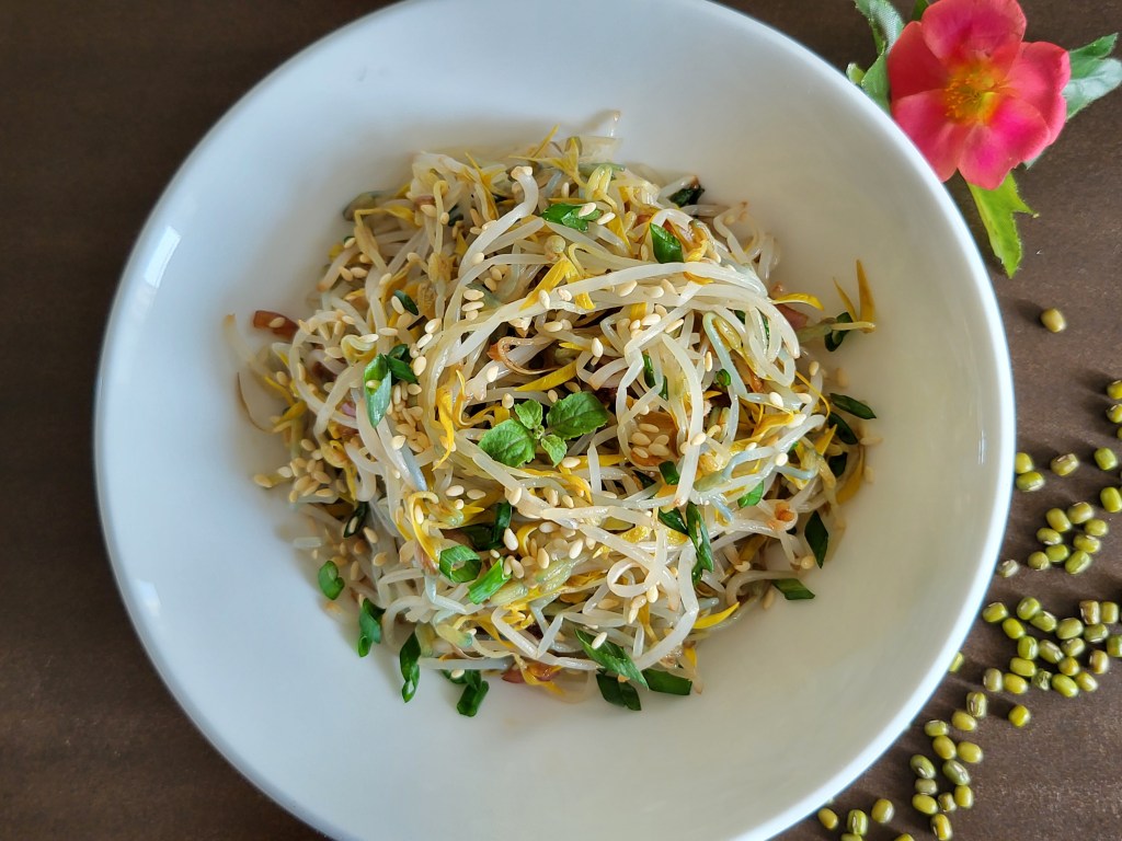 The delicious Mung Bean Sprout Salad is ready! Serve it with hot rice or your favourite dish – it’s got a mild flavour that complements anything!