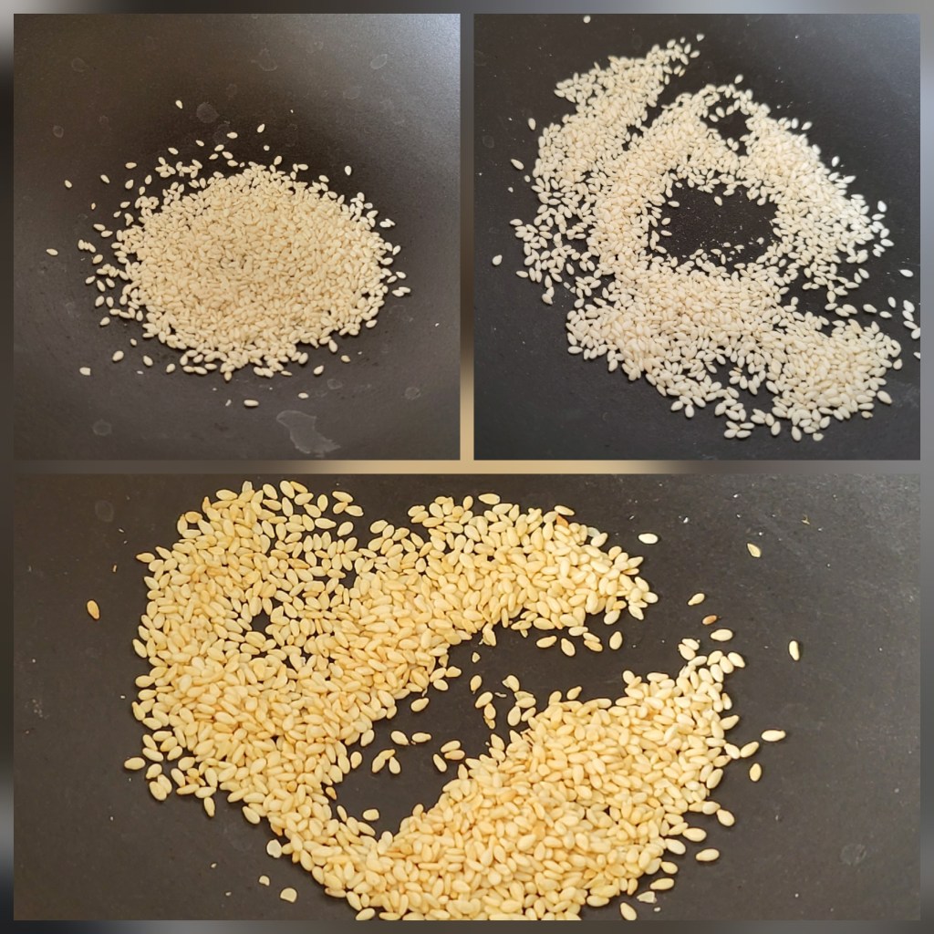 6. Toss the sesame seeds in a pan over medium heat, toast them until golden brown and fragrant.