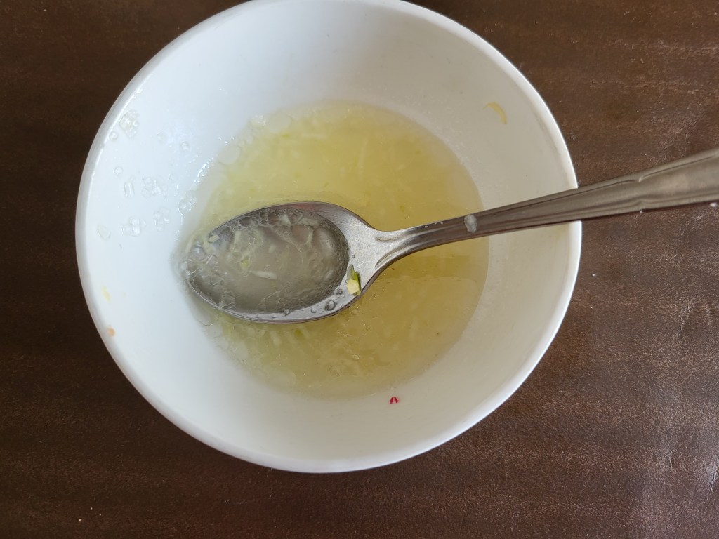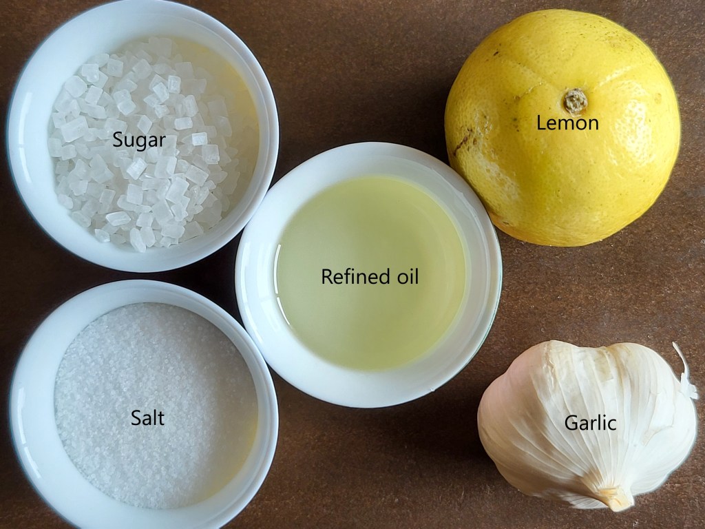 19. Mix 2 tbsp lemon juice, ½ tsp grated garlic, 1 tbsp oil, 1 tsp sugar, and salt to taste. Stir until sugar dissolves.