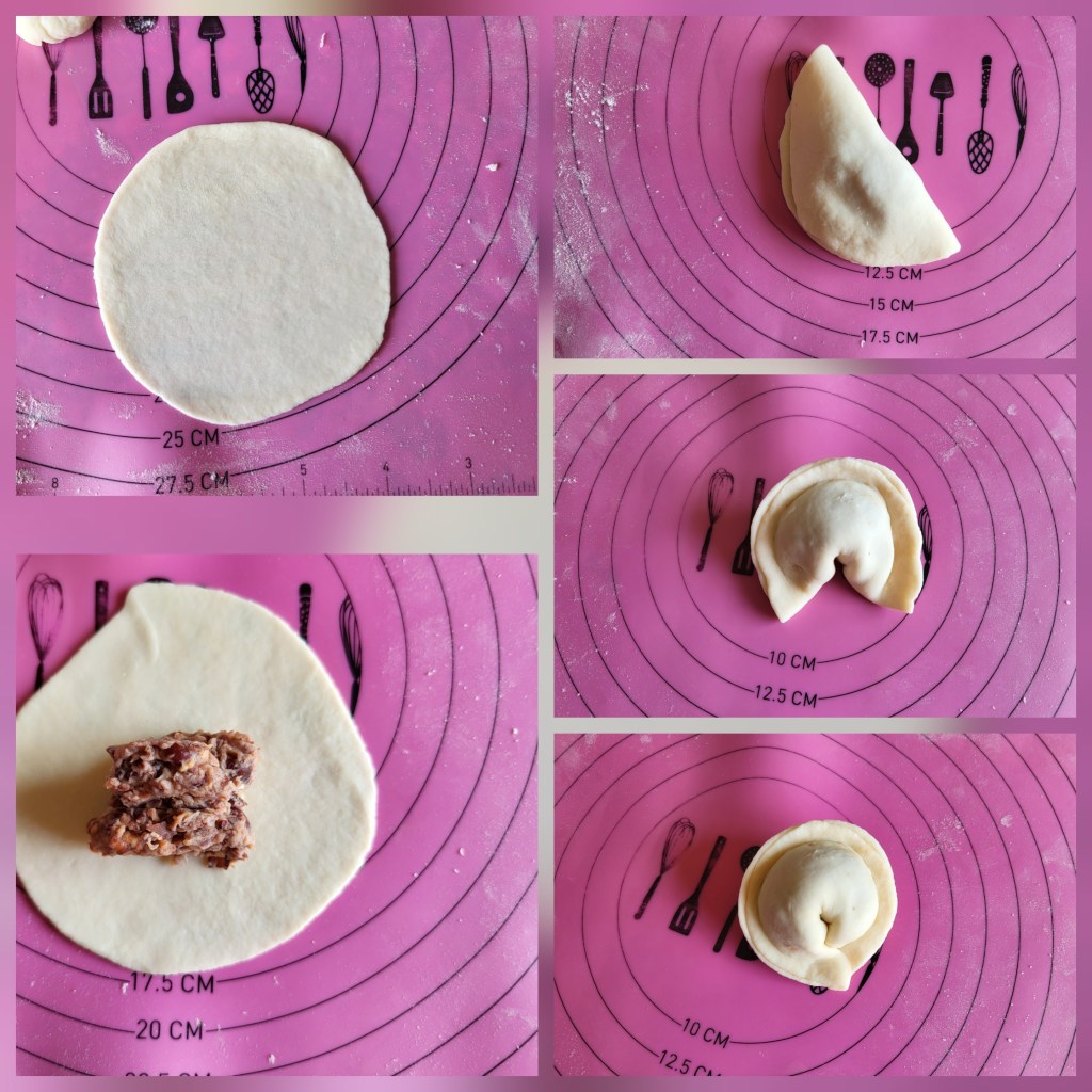 11. Roll out dough balls thinly, place 1 tbsp filling in the center, and fold into a semi-circle.