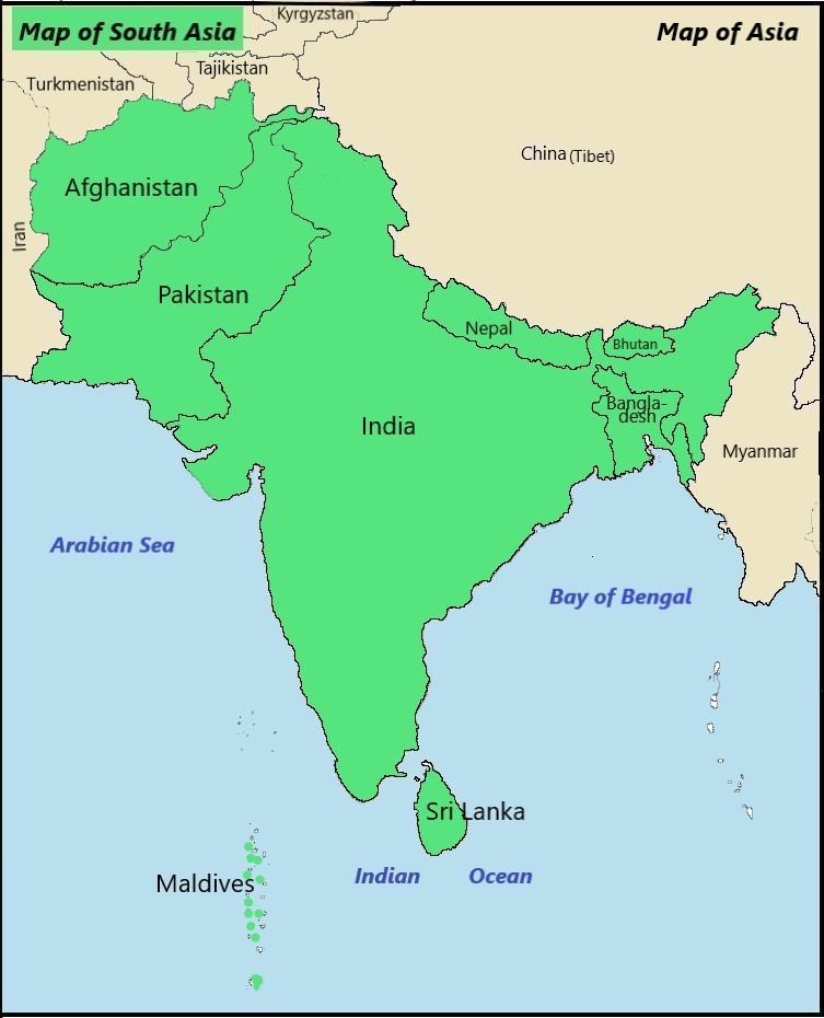 South Asia is the southern part of Asia.  It is known as the Indian subcontinent. It consists of India, Pakistan, Bangladesh, Bhutan, Nepal, Maldives, Sri Lanka, and Afghanistan.