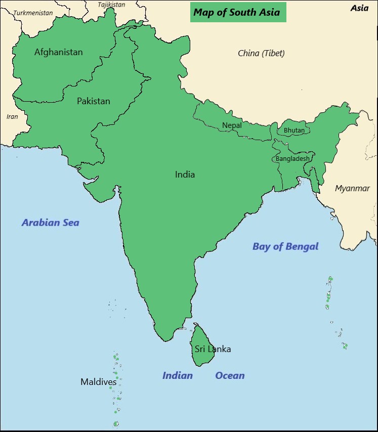 South Asia is the southern part of Asia. It is known as the Indian subcontinent. It consists of India, Pakistan, Bangladesh, Bhutan, Nepal, Maldives, Sri Lanka, and Afghanistan.