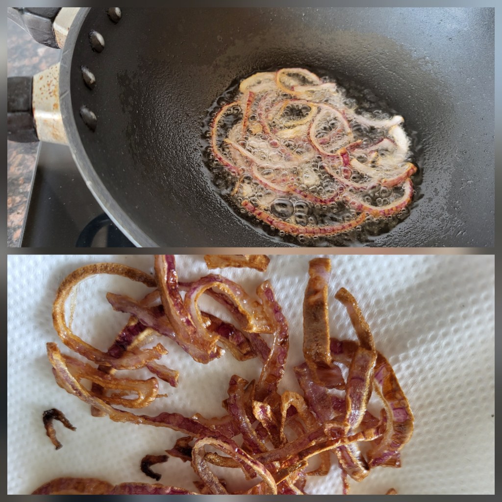 7. Heat oil in a pan and fry 1/3 of the remaining onions until golden brown.