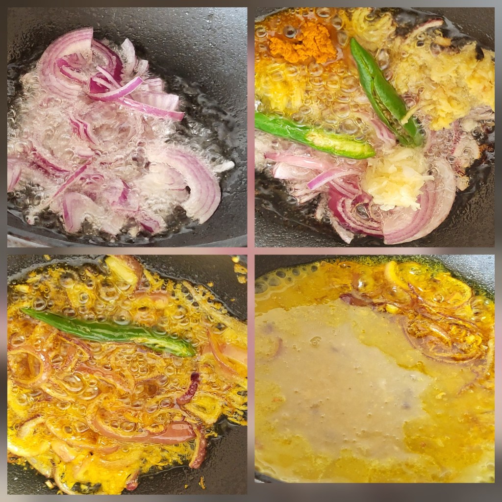 10. Add ginger, garlic, turmeric powder, and green chilies; sauté for a minute or two.