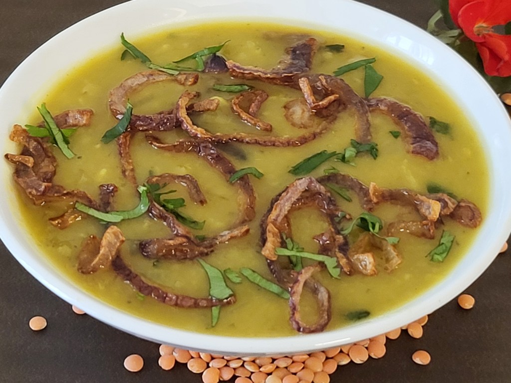 15. Sprinkle the fried onion over the dal and serve hot with steamed rice.