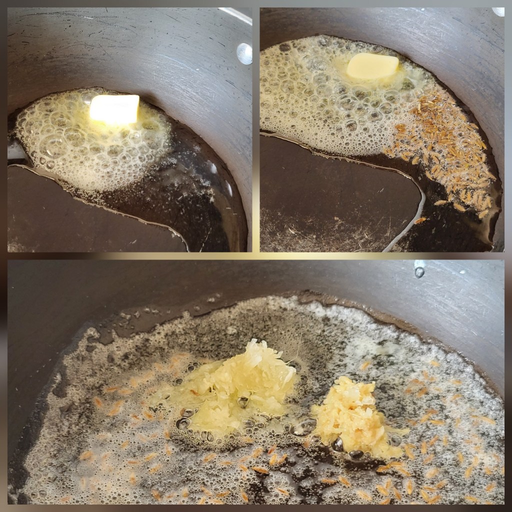 9. Add cumin seeds, sauté briefly, then add the grated ginger and garlic.