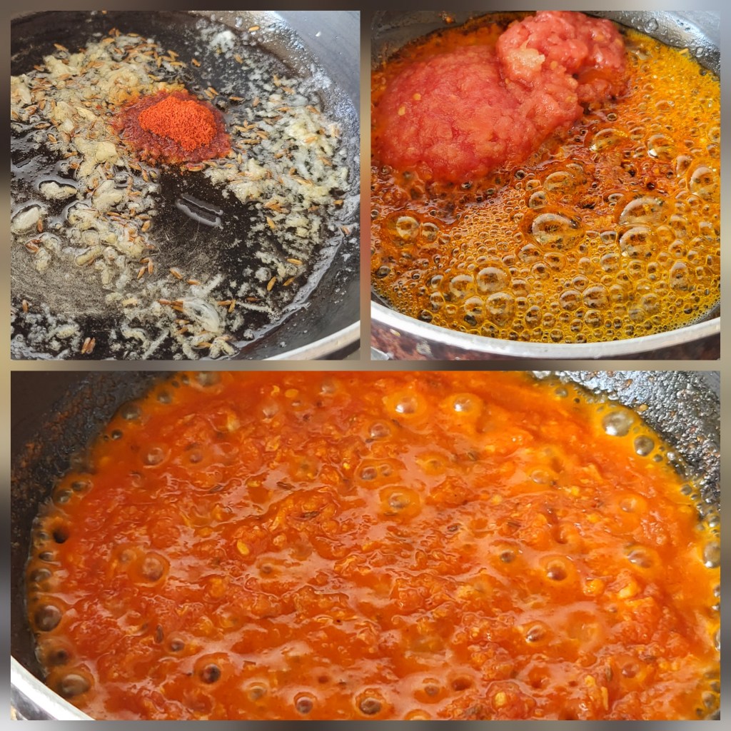 10. Add 1 tsp Kashmiri chili powder, sauté briefly for color, then add the grated tomatoes and mix well.