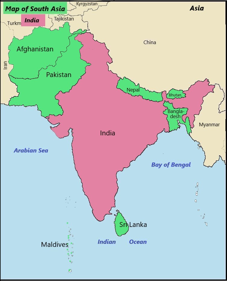 India is located in South Asia, bordered by the Himalayas, Nepal, and Bhutan to the north, Myanmar and the Bay of Bengal to the east, the Indian Ocean to the south, and the Arabian Sea and Pakistan to the west. Delhi is its Capital.