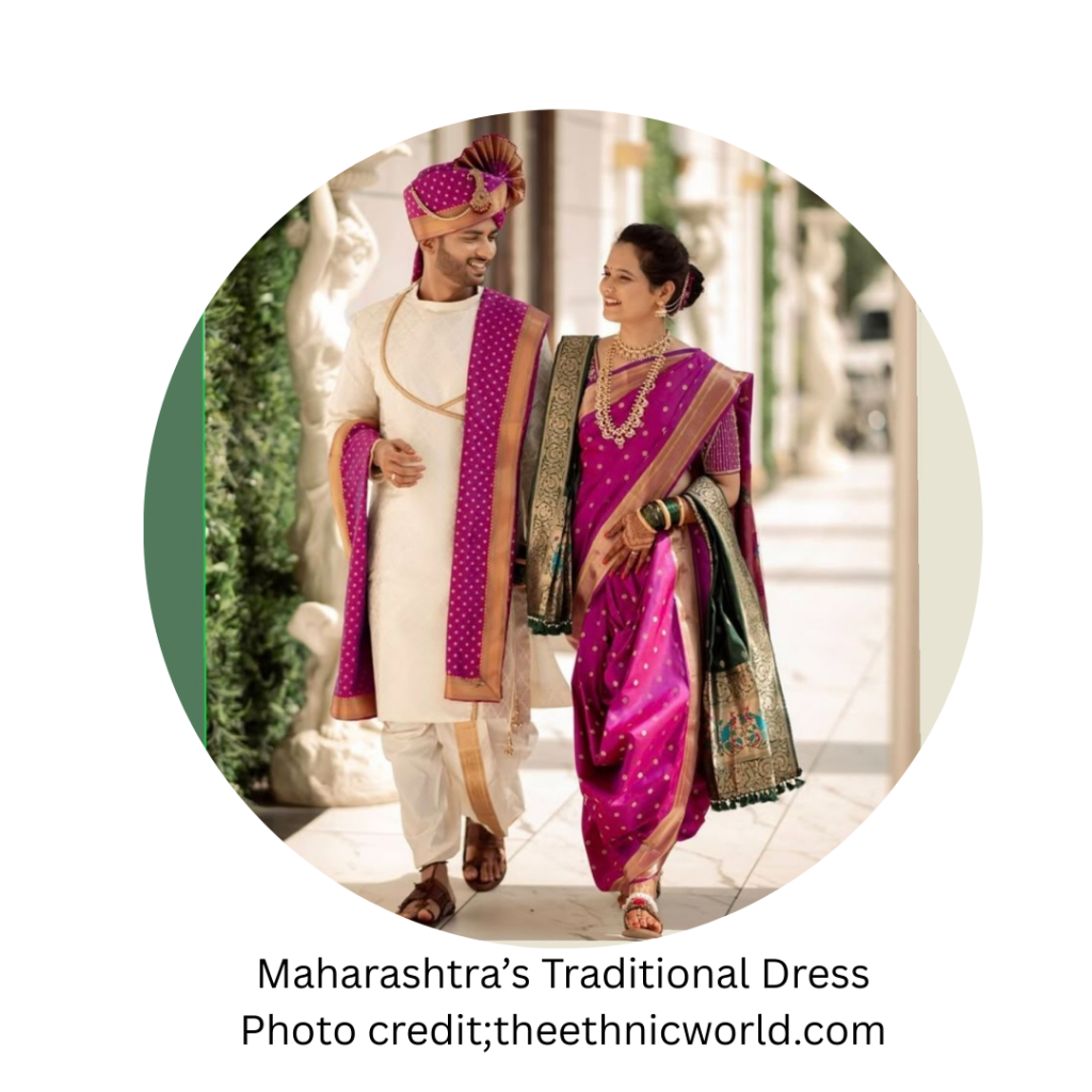 India’s traditional dress is a vibrant mix!  For women, the saree is iconic, while men wear the kurta-pajama or dhoti. But with 28 states and countless ethnic groups, pinning down a ‘national dress’ is tough. Each state has its own style – like Maharashtra’s traditional style: Nauvari saree (9-yard) draped like a dhoti for women, Dhoti Kurta for men.